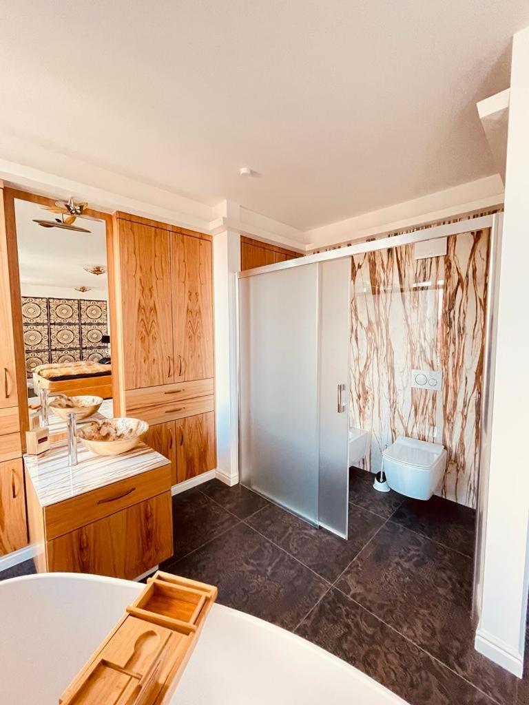 Penthouse-Apartment. This spacious apartment is comprised of 1 living room, 2 separate bedrooms and 2 bathrooms with a walk-in shower and free toiletries. The apartments kitchen, which features a refrigerator and kitchenware, is available for cooking and storing food. Featuring a terrace with garden views, this apartment also offers a washing machine and a flat-screen TV. The unit offers 2 beds.