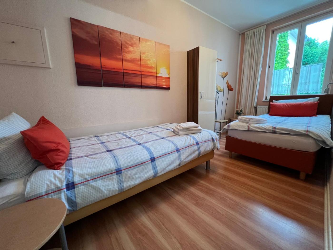 Apartment mit Gartenblick. Diese geräumige Ferienwohnung umfasst einen eigenen Eingang, 1 Wohnzimmer, 2 separate Schlafzimmer und 1 Bad mit einer Dusche. Die gut ausgestattete Küche verfügt über ein Kochfeld, einen Kühlschrank, einen Geschirrspüler und Küchenutensilien. Grillmöglichkeiten sind ebenfalls vorhanden. Zu den weiteren Annehmlichkeiten der Ferienwohnung gehören eine Waschmaschine, Tee- und Kaffeezubehör, ein Sitzbereich, ein Flachbild-Kabel-TV sowie Gartenblick. In dieser Wohneinheit befinden sich 4 Betten.