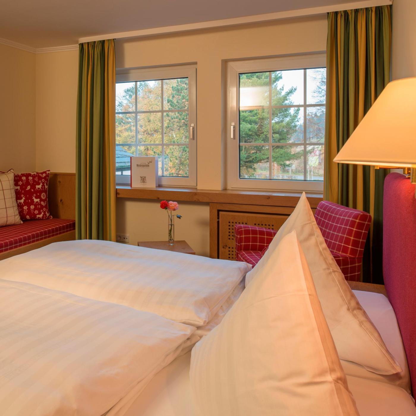 Standard Doppelzimmer. Ruhiges Zimmer mit Blick auf den Garten und die Landschaft. ;