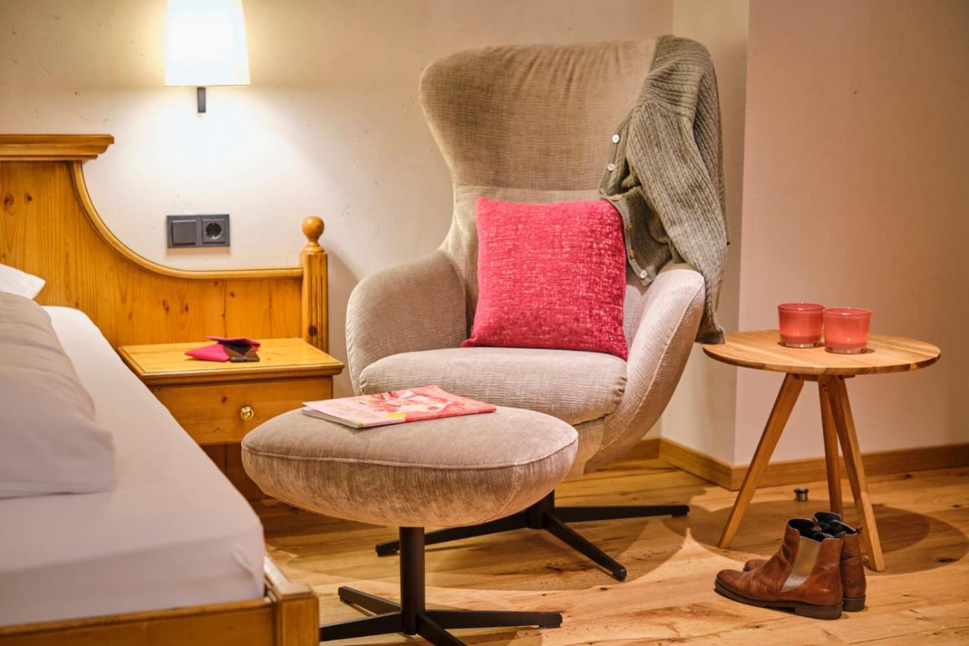 Deluxe Zimmer. Das geräumige Doppelzimmer bietet einen Sitzbereich, einen Kleiderschrank, eine Terrasse mit Gartenblick sowie ein eigenes Bad mit einer ebenerdigen Dusche. In der Wohneinheit befinden sich 2 Betten. ;