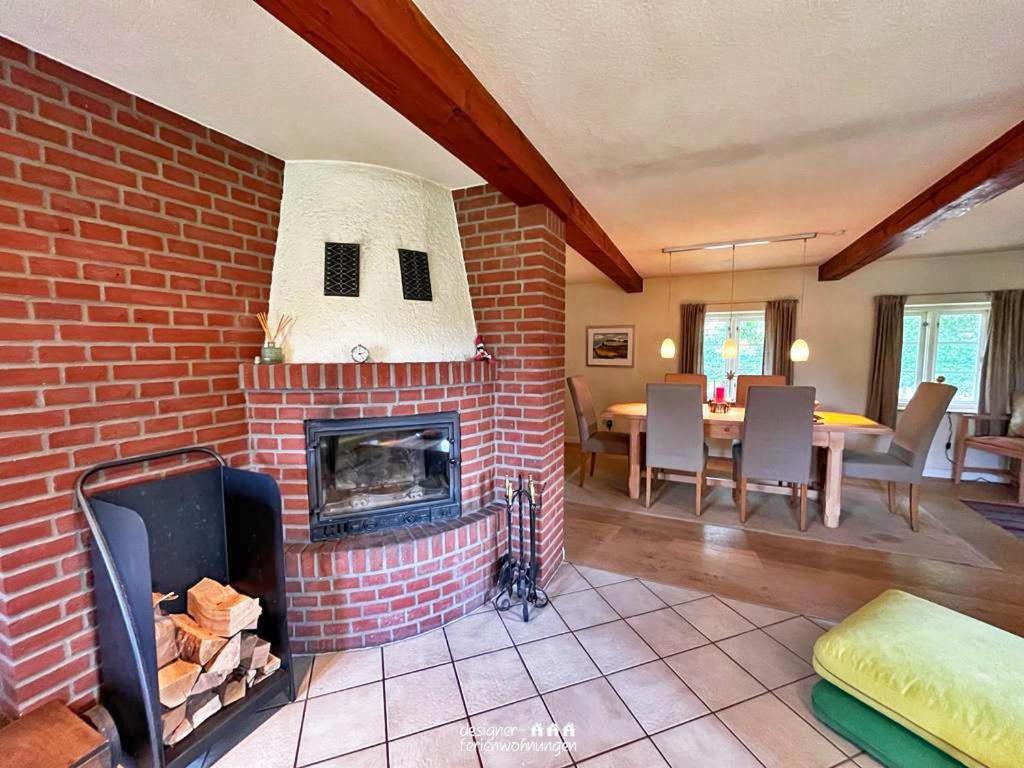 Ferienhaus. The fireplace is a top feature of this holiday home. The spacious holiday home features a washing machine, a coffee machine, a seating area, a dining area and a TV.