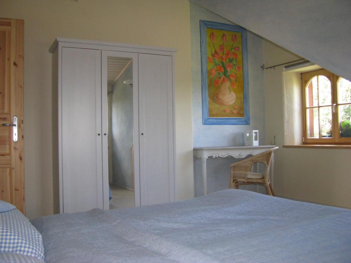 Doppel-Zweibettzimmer mit Dusche. The small guest room is on the ground floor. It offers a small shower and toilet. Please note, this room has a vaulted ceiling which is not suittable for very tall people.