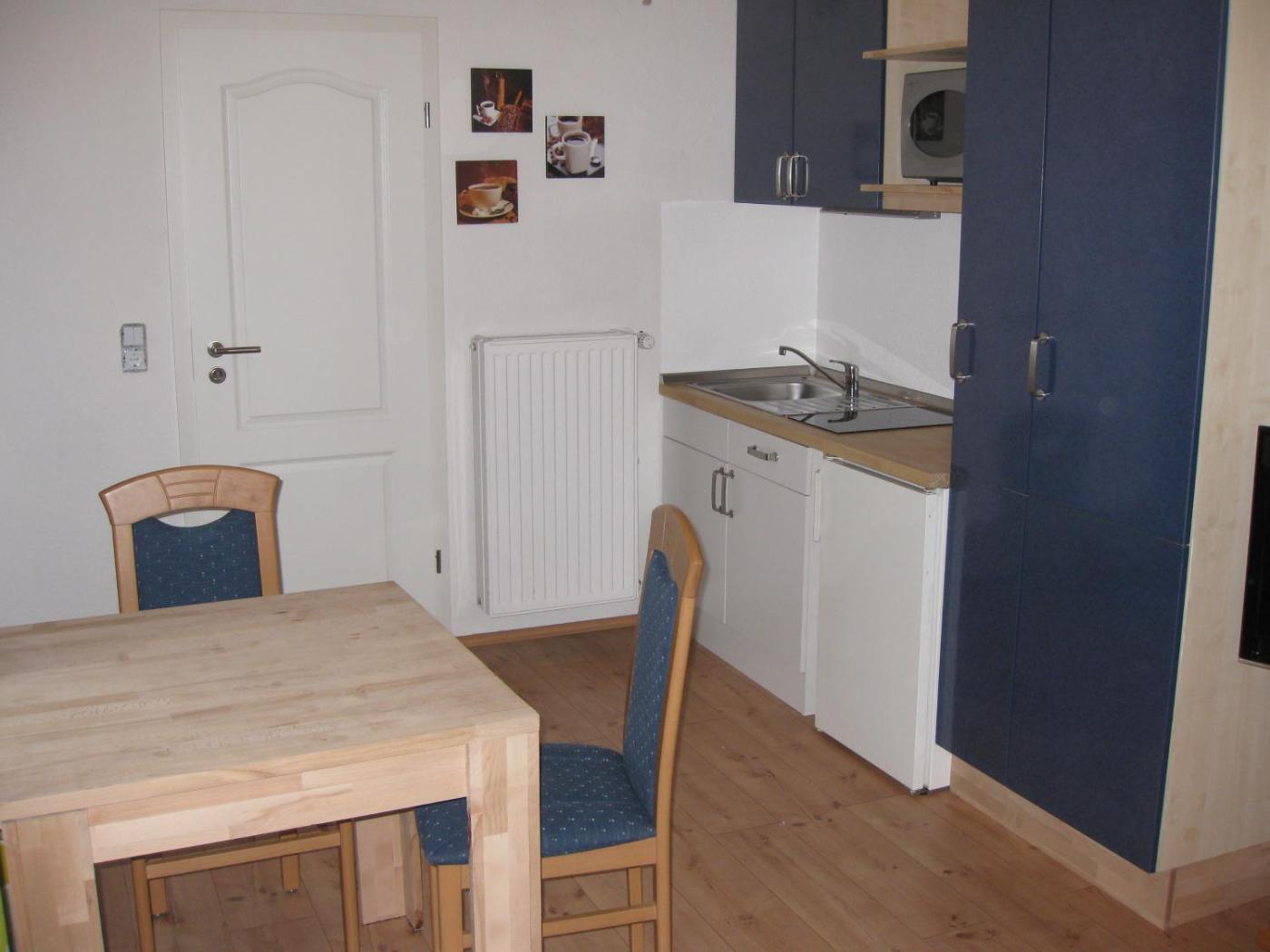 Studio-Apartment. Dieses Studio-Apartment verfügt über eine kleine Küchenzeile mit einer Mikrowelle, einem kleinen Kochfeld, einem Kühlschrank und einem kleinen Gefrierschrank.