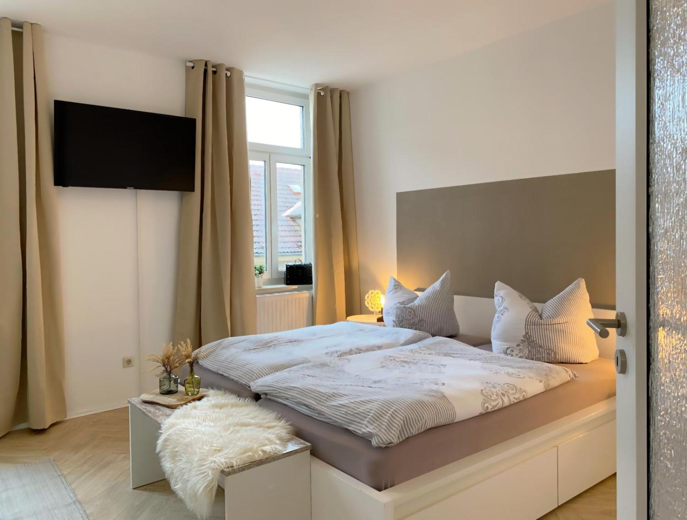 Apartment mit 2 Schlafzimmern. This apartment comes with a kitchen, a seating area, 2 separate bedrooms and 1 bathroom with a walk-in shower and a hairdryer. In the well-equipped kitchen, guests will find a stovetop, a refrigerator, a dishwasher and kitchenware. The apartment features a tea and coffee maker, a dining area, a wardrobe, a flat-screen TV with satellite channels, as well as ancourtyard view. The unit has 3 beds.