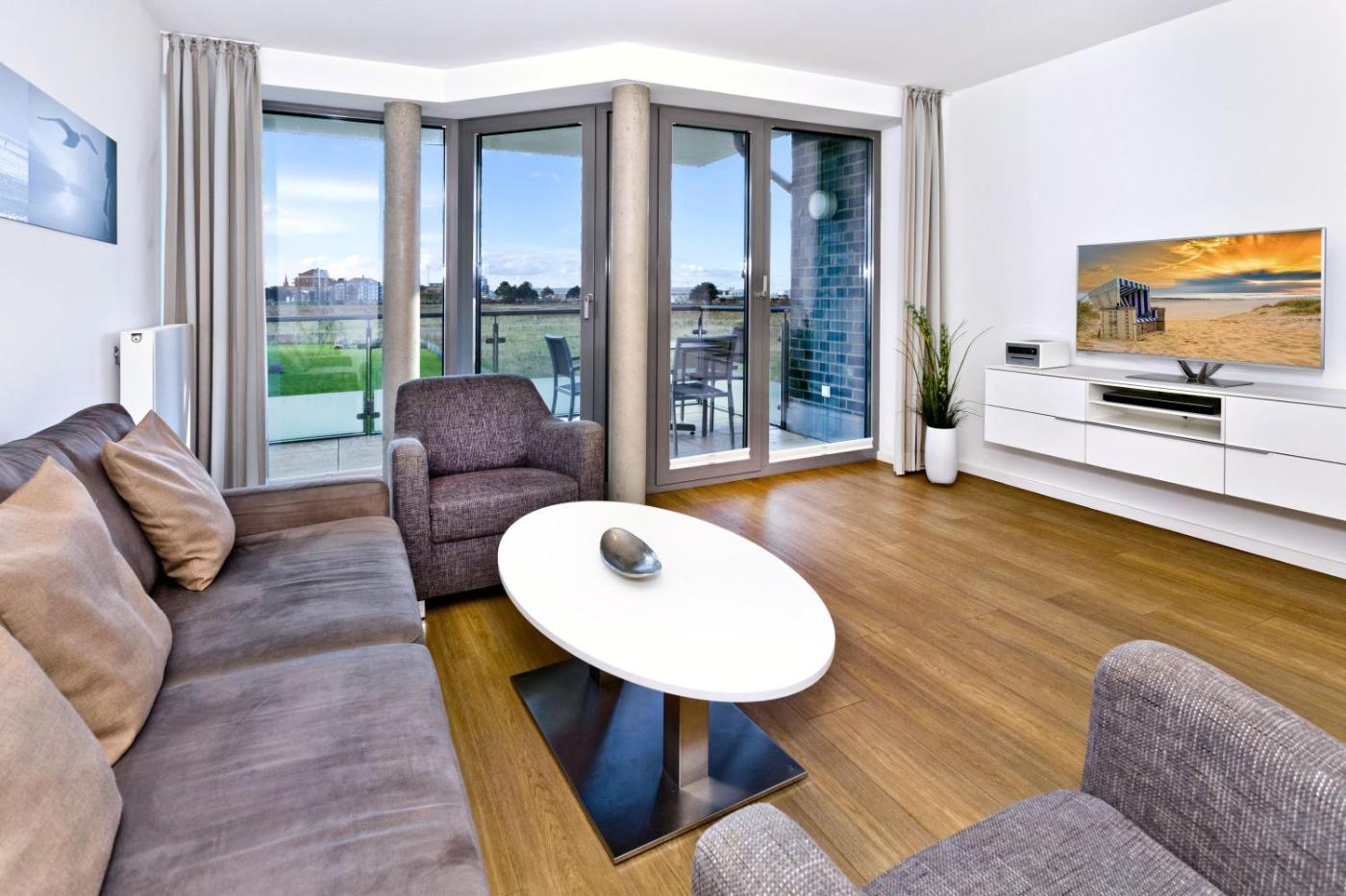 Apartment. This spacious apartment includes 2 bedrooms, a kitchenette and 1 bathroom with a hairdryer. In the well-fitted kitchenette, guests will find a refrigerator, a dishwasher, an oven and a microwave. The air-conditioned apartment offers a TV with satellite channels, a washing machine, a coffee machine, tumble dryer as well as sea views. The unit has 2 beds.