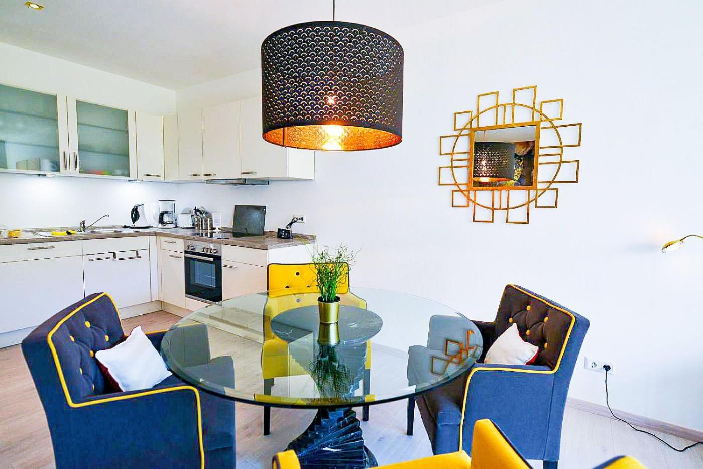 Die Küche ist eingerichtet mit einem Kühlschrank und einem Geschirrspüler, einem Ofen sowie einer Kaffeemaschine und einem Wasserkocher.