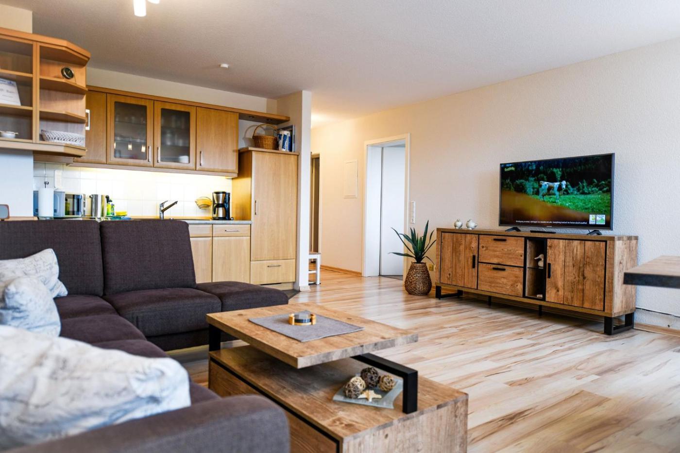 Apartment mit Balkon. This apartment features a kitchen, a seating area, 2 separate bedrooms and 1 bathroom with a shower and a hairdryer. Meals can be prepared in the kitchen, which has a stovetop, a refrigerator, a dishwasher and kitchenware. Boasting a balcony, this apartment also features a washing machine, a coffee machine and a TV. The unit has 2 beds.