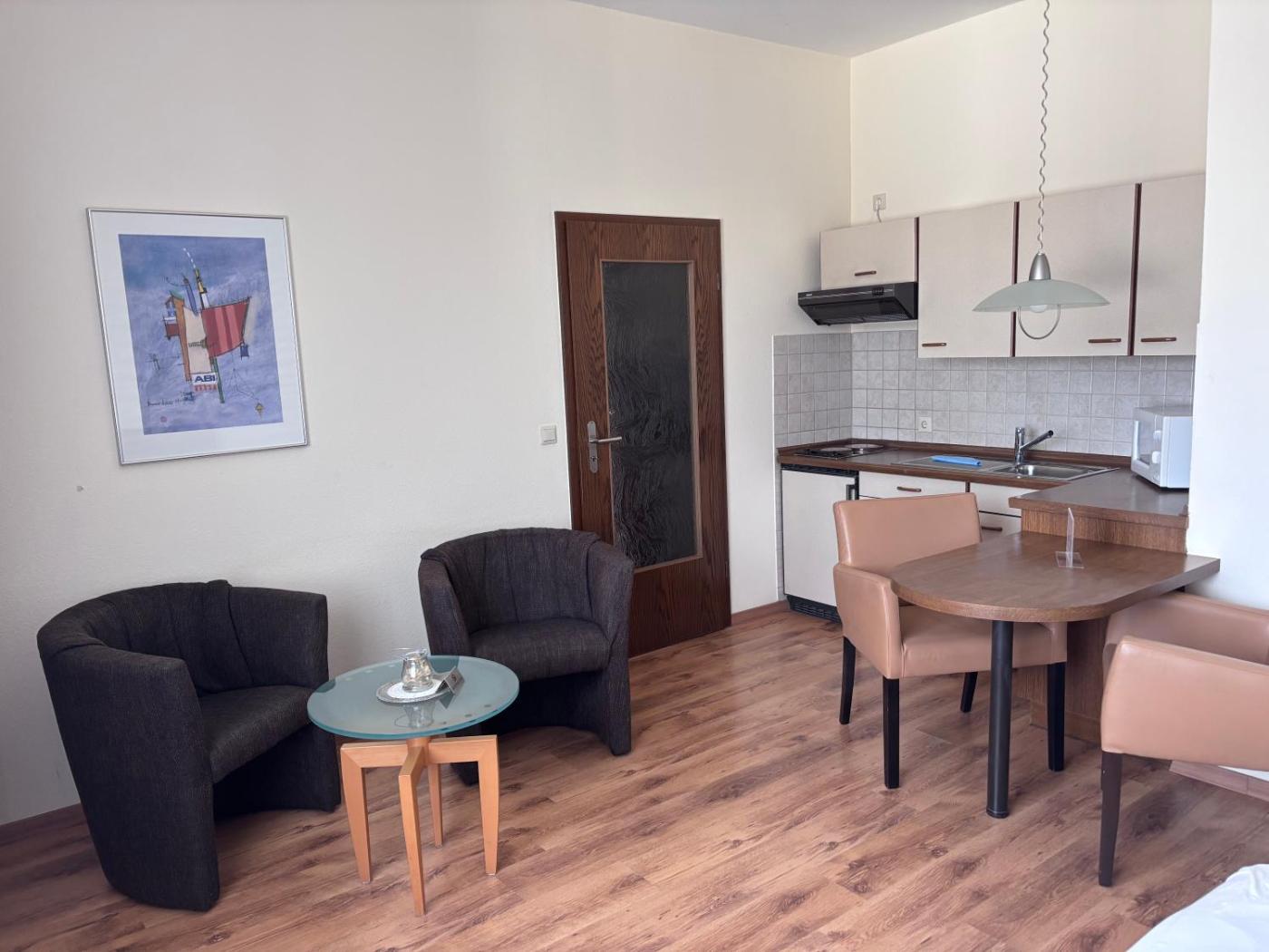 Jedes Apartment verfügt über eine Küchenzeile mit einem Essbereich und einen Wohnbereich mit Sat-TV. Die Zimmer sind geräumig und klassisch im modernen Stil eingerichtet.