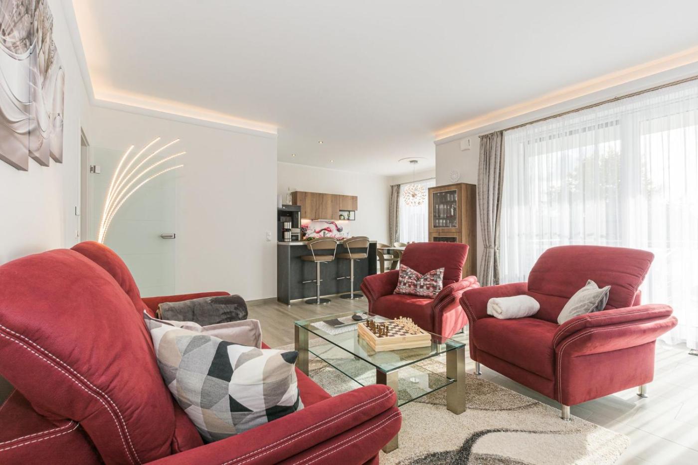 Apartment mit 2 Schlafzimmern und Balkon. The sauna and fireplace are the special features of this apartment. This spacious apartment comes with 1 living room, 2 separate bedrooms and 2 bathrooms with a shower and a hairdryer. Guests will find a refrigerator, a dishwasher, an oven and a microwave in the well-fitted kitchenette. The apartment also includes a barbecue. This apartment has a washing machine, a coffee machine, a flat-screen TV with cable channels and a balcony. The unit has 2 beds.