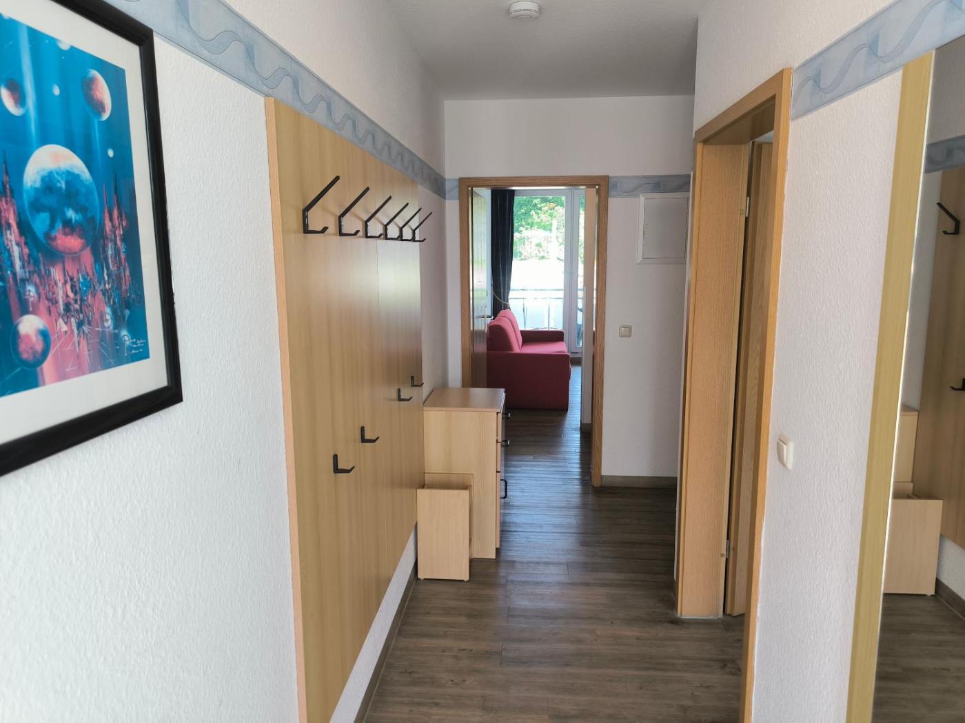 Apartment mit Balkon. This apartment consists of 1 living room, 1 separate bedroom and 1 bathroom with a shower. Guests can make meals in the kitchen that is equipped with a stovetop, a refrigerator, a dishwasher and kitchenware. A seating area with a TV, a coffee machine and a balcony are provided in this apartment. The unit offers 2 beds.