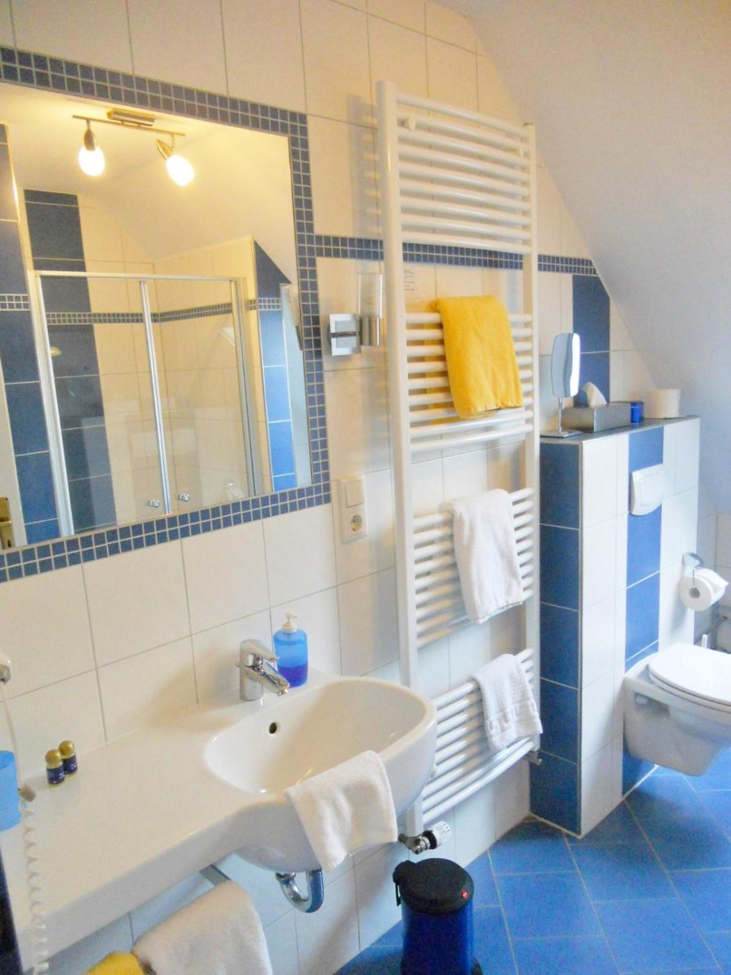 Doppelzimmer. Dieses Doppelzimmer verfügt über eine Sitzecke mit Sesseln oder einem Sofa. Das Badezimmer ist mit einer Dusche, einem Haartrockner und einem Handtuchwärmer ausgestattet. Alle Zimmer sind mit Möbeln im friesischen Landhausstil eingerichtet. ;