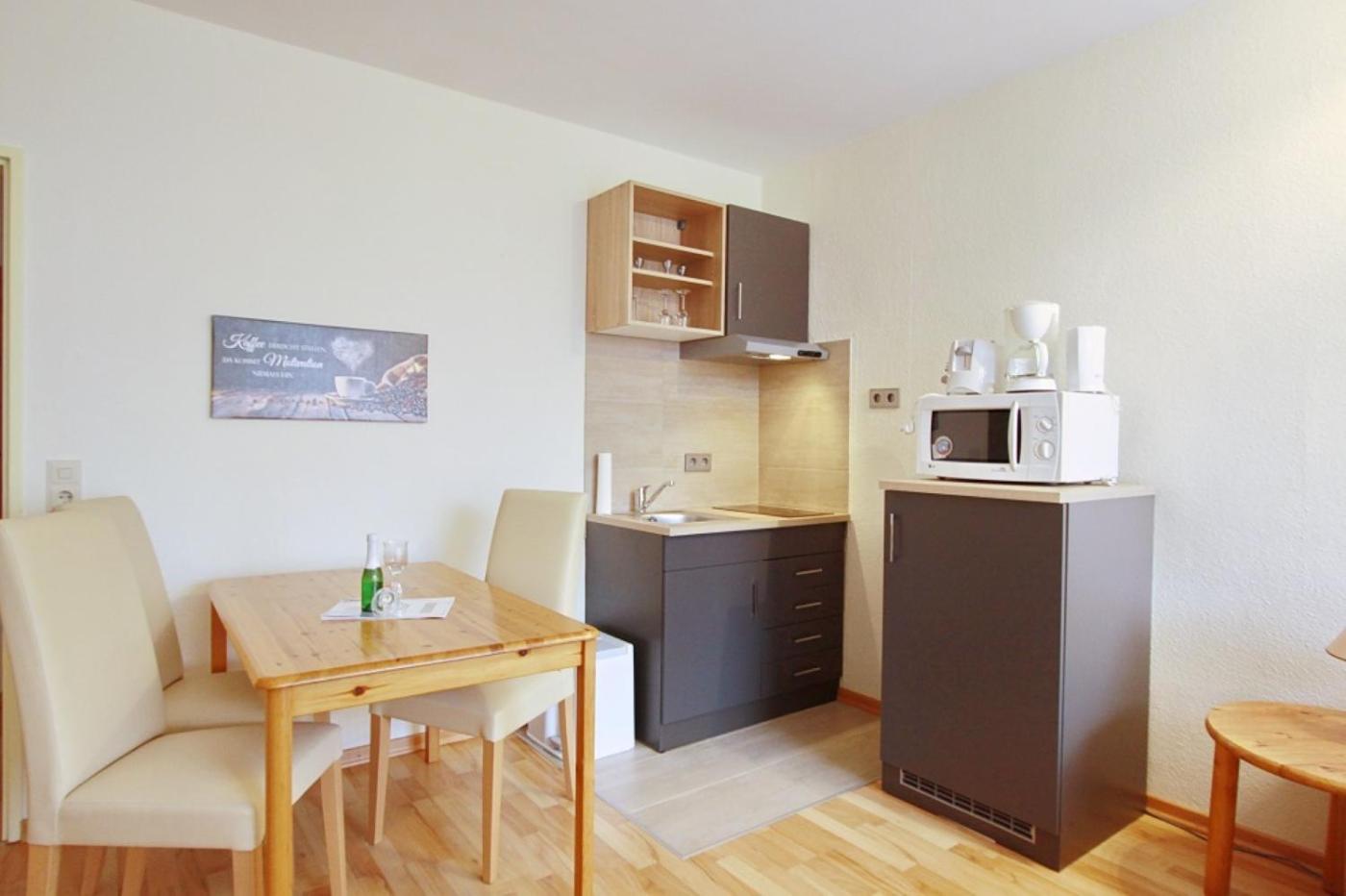 Die Küche ist versehen mit einem Kühlschrank und einer Mikrowelle, einer Herdplatte sowie einer Kaffeemaschine und einem Wasserkocher.
