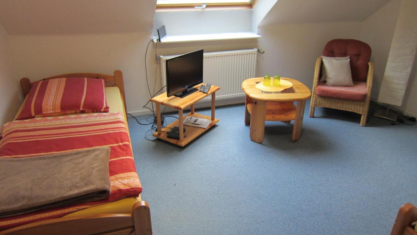 Einzelzimmer mit Gemeinschaftsbad. Featuring a private entrance, a seating area and a carpeted floor, this single room includes a shared bathroom. This single room features heating and a TV. The unit has 1 bed. ;