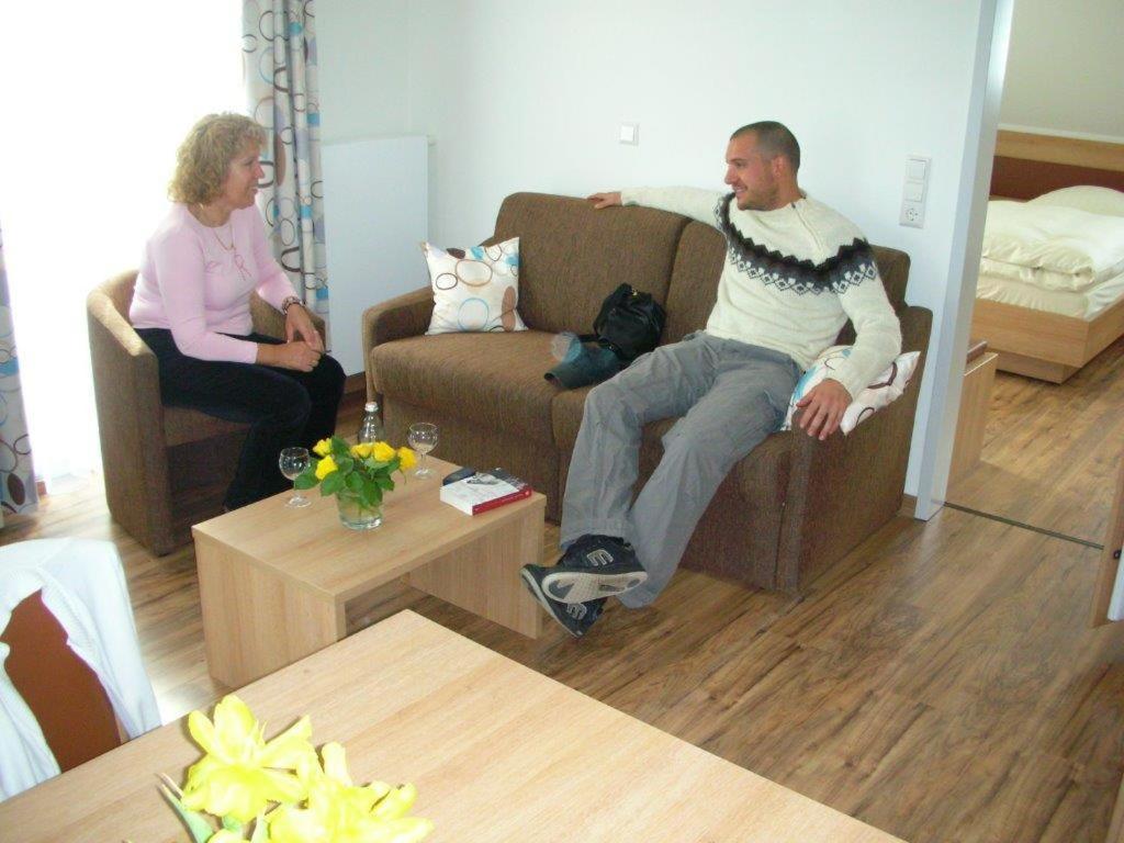 Apartment. Dieses Apartment verfügt über ein Sofa, eine kleine Küchenzeile, einen Essbereich und Sat-TV.