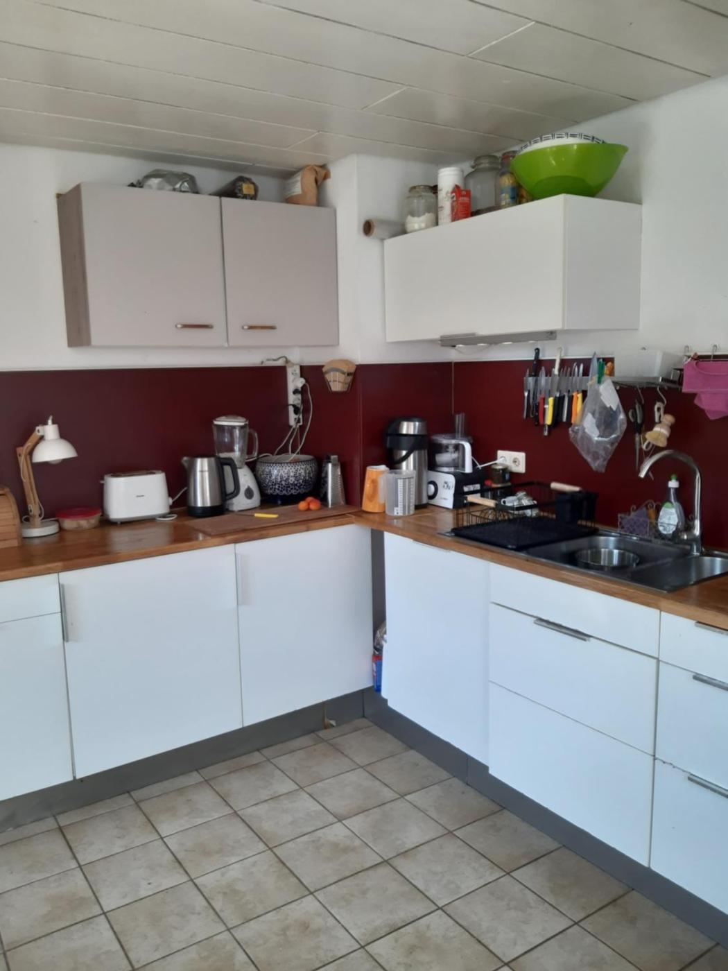 Die Küche ist versehen mit einem Kühlschrank und einem Geschirrspüler, einem Ofen sowie einer Kaffeemaschine und einem Wasserkocher.