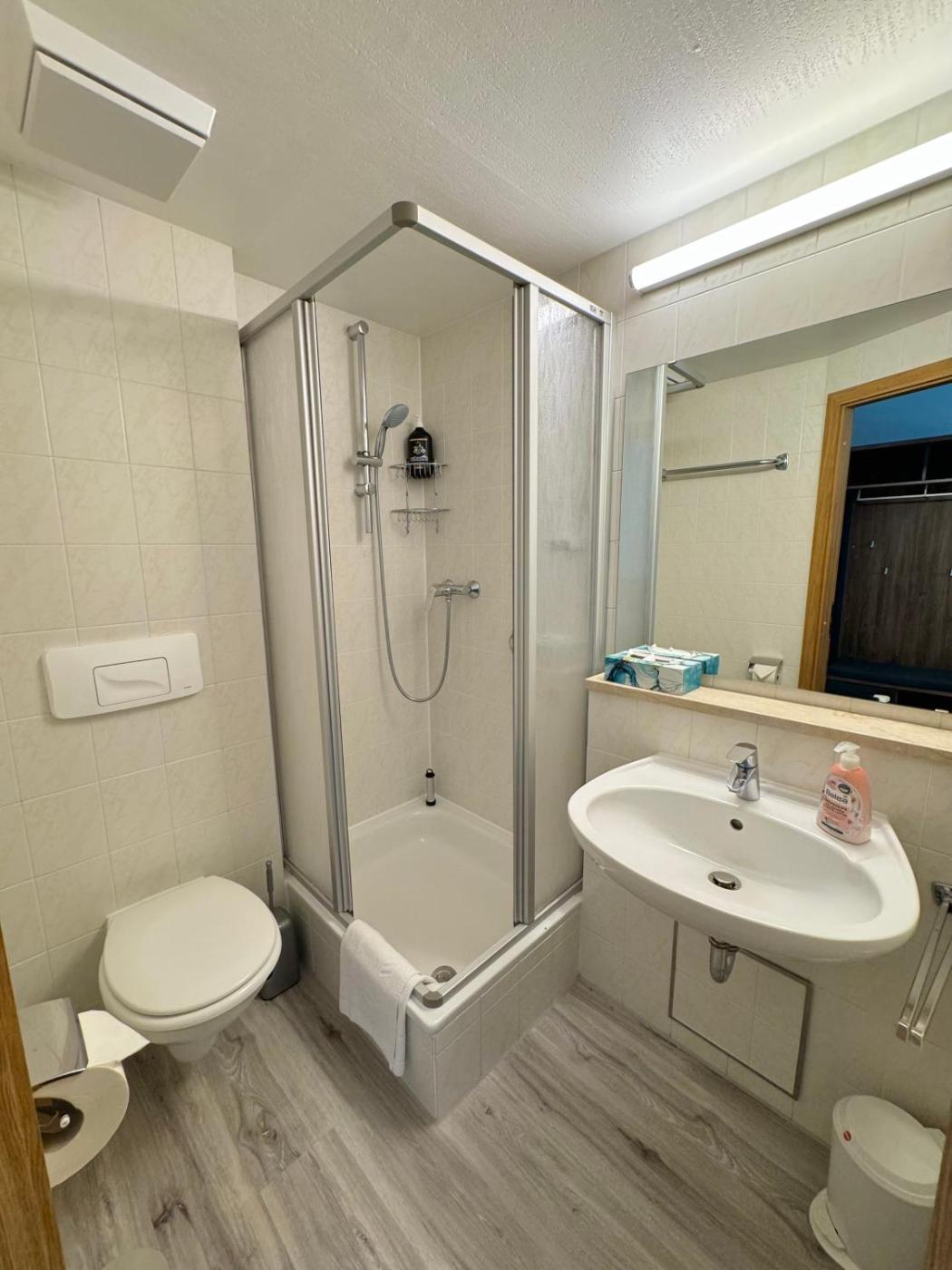 Vierbettzimmer. The quadruple room offers a carpeted floor, heating, as well as a private bathroom boasting a shower and a hairdryer. This quadruple room has a wardrobe, a safe deposit box, flat-screen TV with cable channels, as well as chocolate for guests. The unit has 3 beds. ;