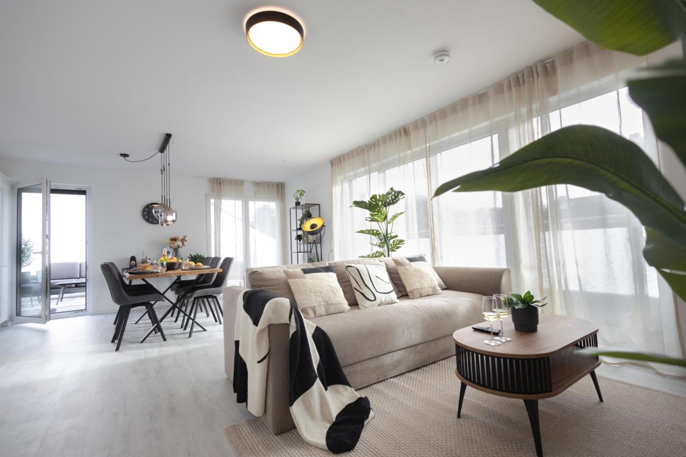 Penthouse-Apartment. This spacious apartment comprises 1 living room, 2 separate bedrooms and 1 bathroom with a walk-in shower and free toiletries. In the kitchen, guests will find a stovetop, a refrigerator, a dishwasher and kitchenware. Featuring a terrace with city views, this apartment also provides a washing machine and a flat-screen TV with streaming services. The unit offers 3 beds.