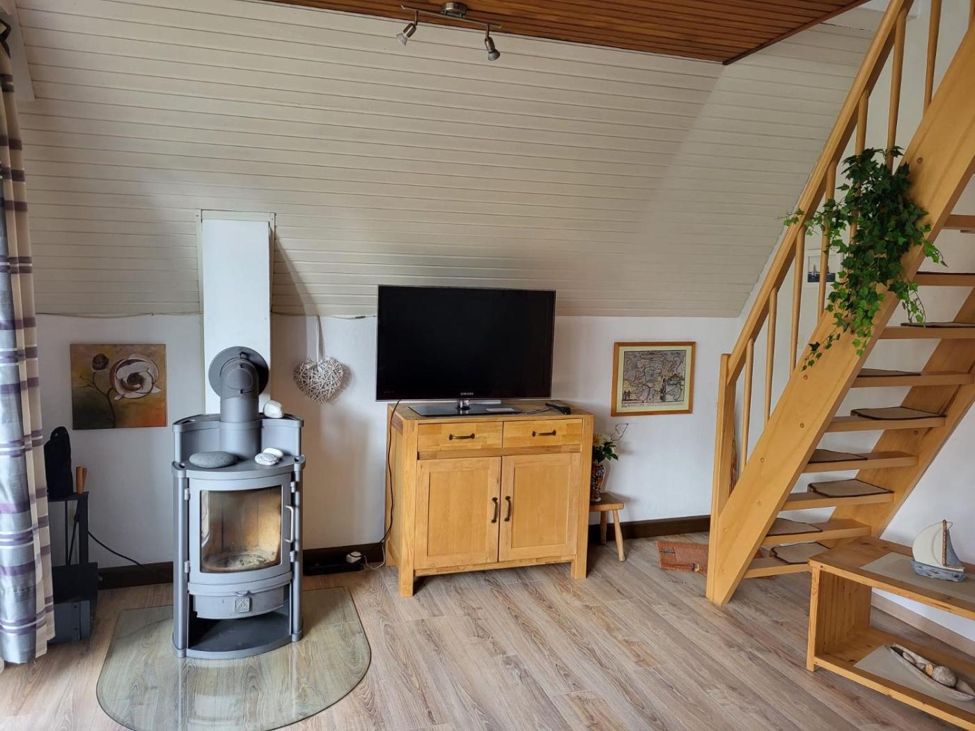 Ferienhaus. The fireplace is the standout feature of this holiday home. Boasting a private entrance, this holiday home also features 2 bedrooms, a seating area and 1 bathroom with a shower and a hairdryer. The fully equipped kitchen has a stovetop, a refrigerator, kitchenware and an oven. Featuring a terrace with garden views, this holiday home also features a coffee machine and a TV with satellite channels. The unit has 3 beds.