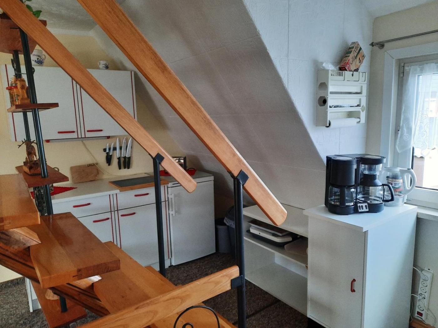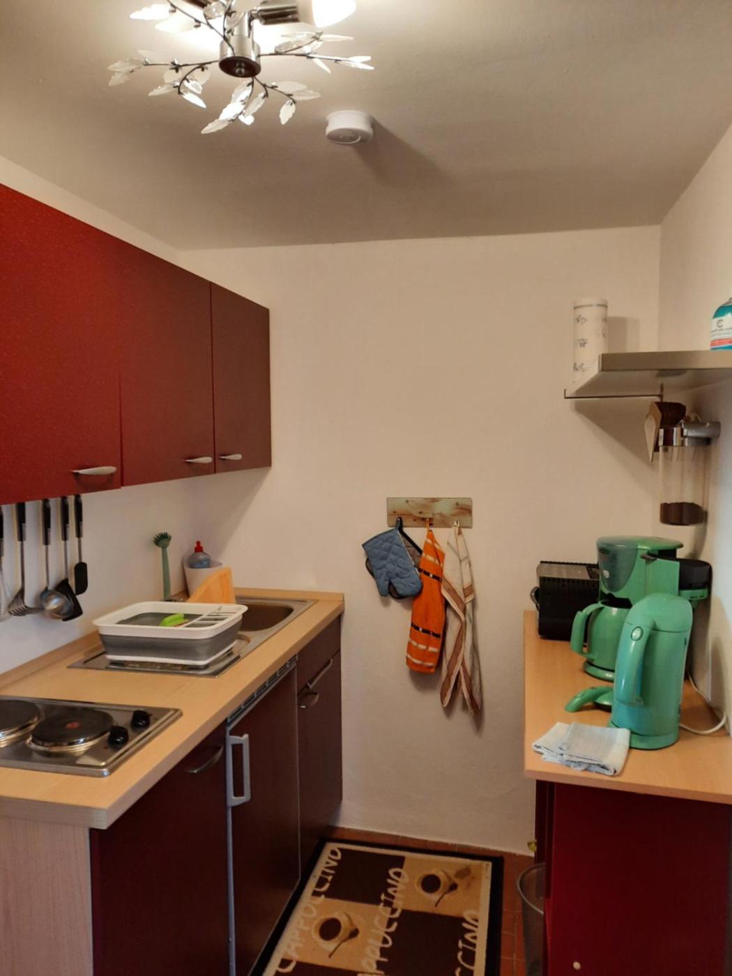 Es gibt einen Kühlschrank, eine Herdplatte und einen Toaster sowie auch eine Kaffeemaschine in der Küche.