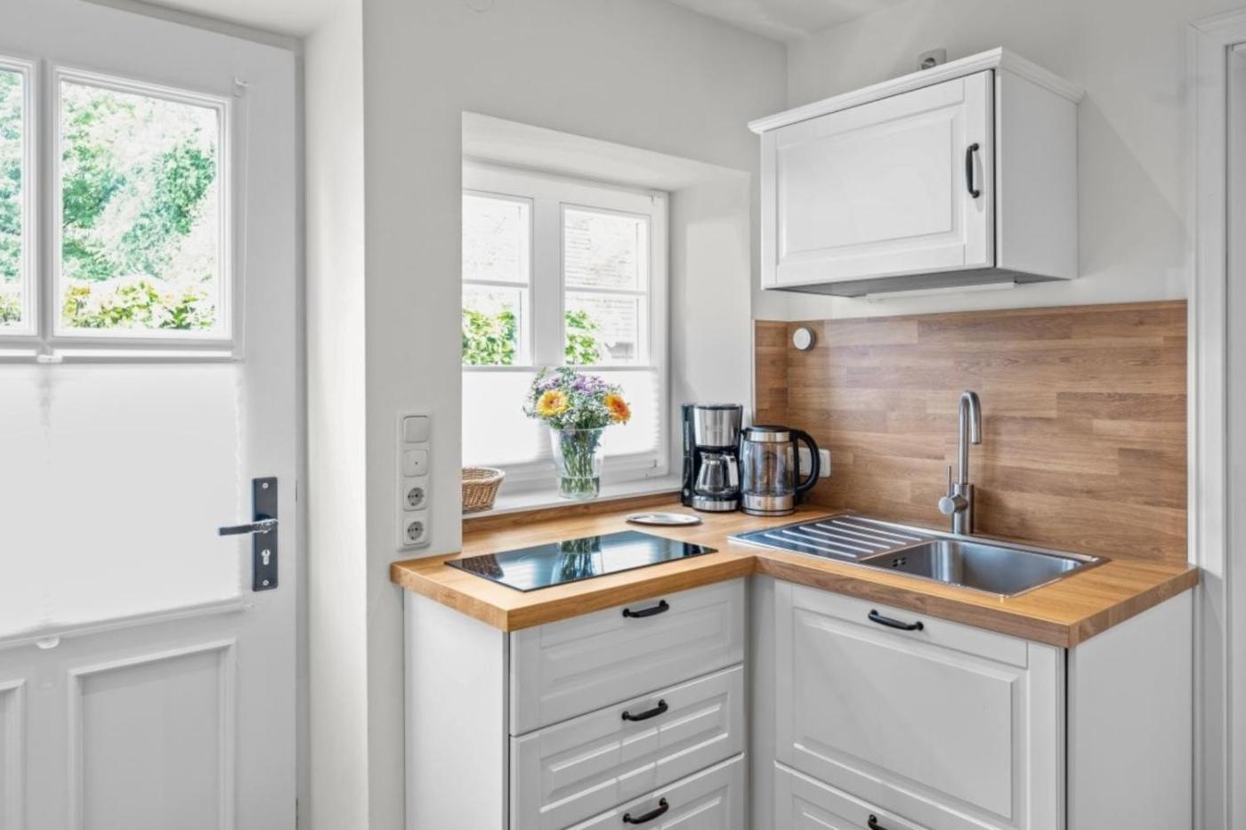 Die Küchenzeile ist versehen mit einem Kühlschrank und einer Mikrowelle, einer Herdplatte sowie einer Kaffeemaschine und einem Wasserkocher.