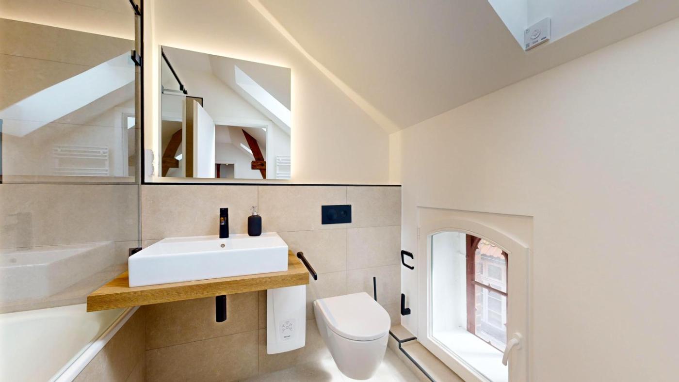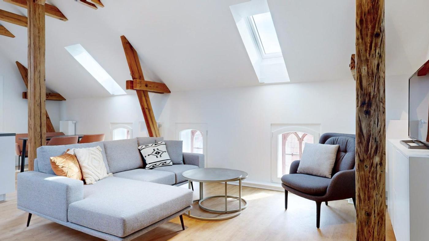 Loft-Apartment mit 2 Schlafzimmern. This spacious apartment comprises 1 living room, 2 separate bedrooms and 2 bathrooms with a bath and free toiletries. The well-equipped kitchen features a stovetop, a refrigerator, a dishwasher and kitchenware. The apartment provides a flat-screen TV with streaming services, a washing machine, a private entrance, soundproof walls as well as city views. The unit offers 3 beds.