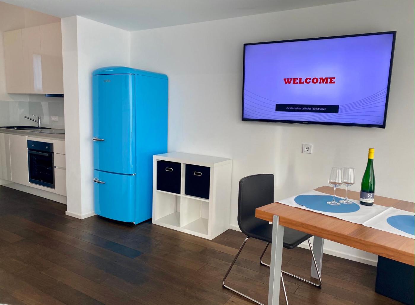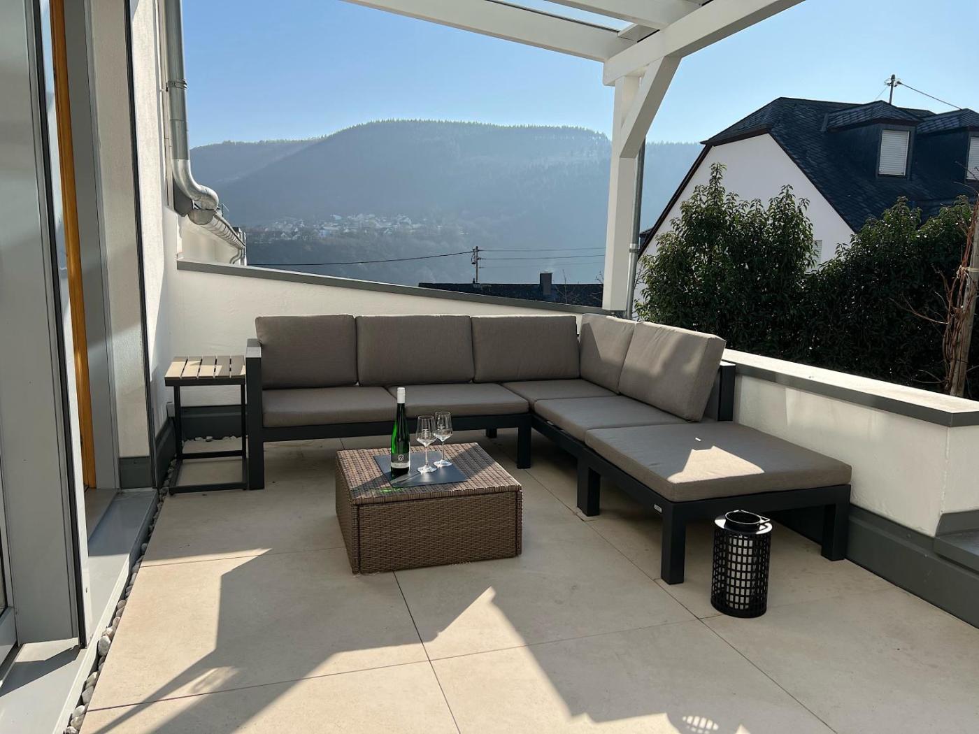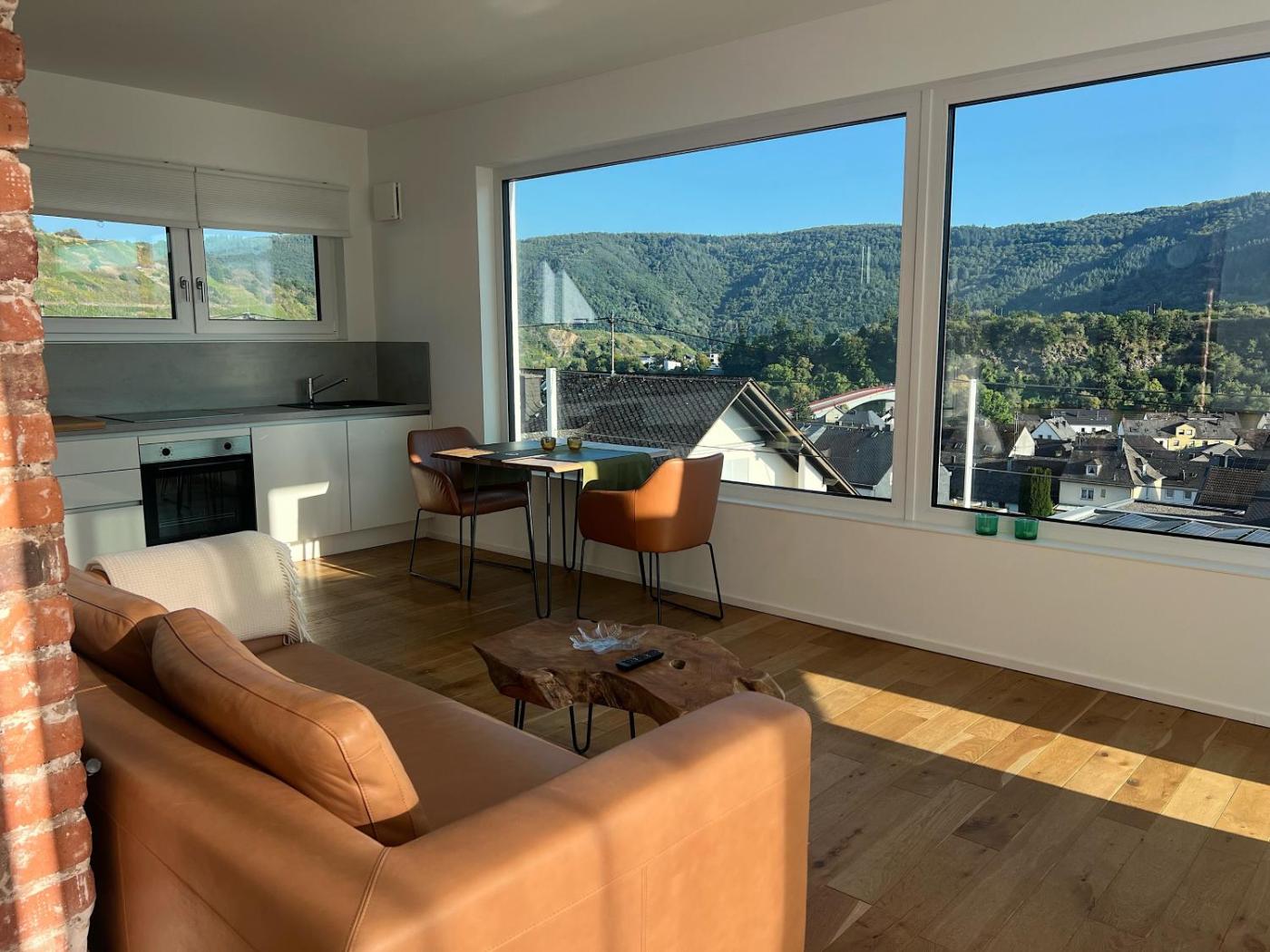 Penthouse-Suite mit Moselblick. This comfort studio is located on the second floor and features a fully equipped kitchen, a dining area with chairs, a large sofa and a 50-inch and 55-inch flat-screen TV. The bathroom comes with a shower and hairdryer. On the terrace there is a seating lounge, dining area, sun lounger with parasol and its own gas grill. ;