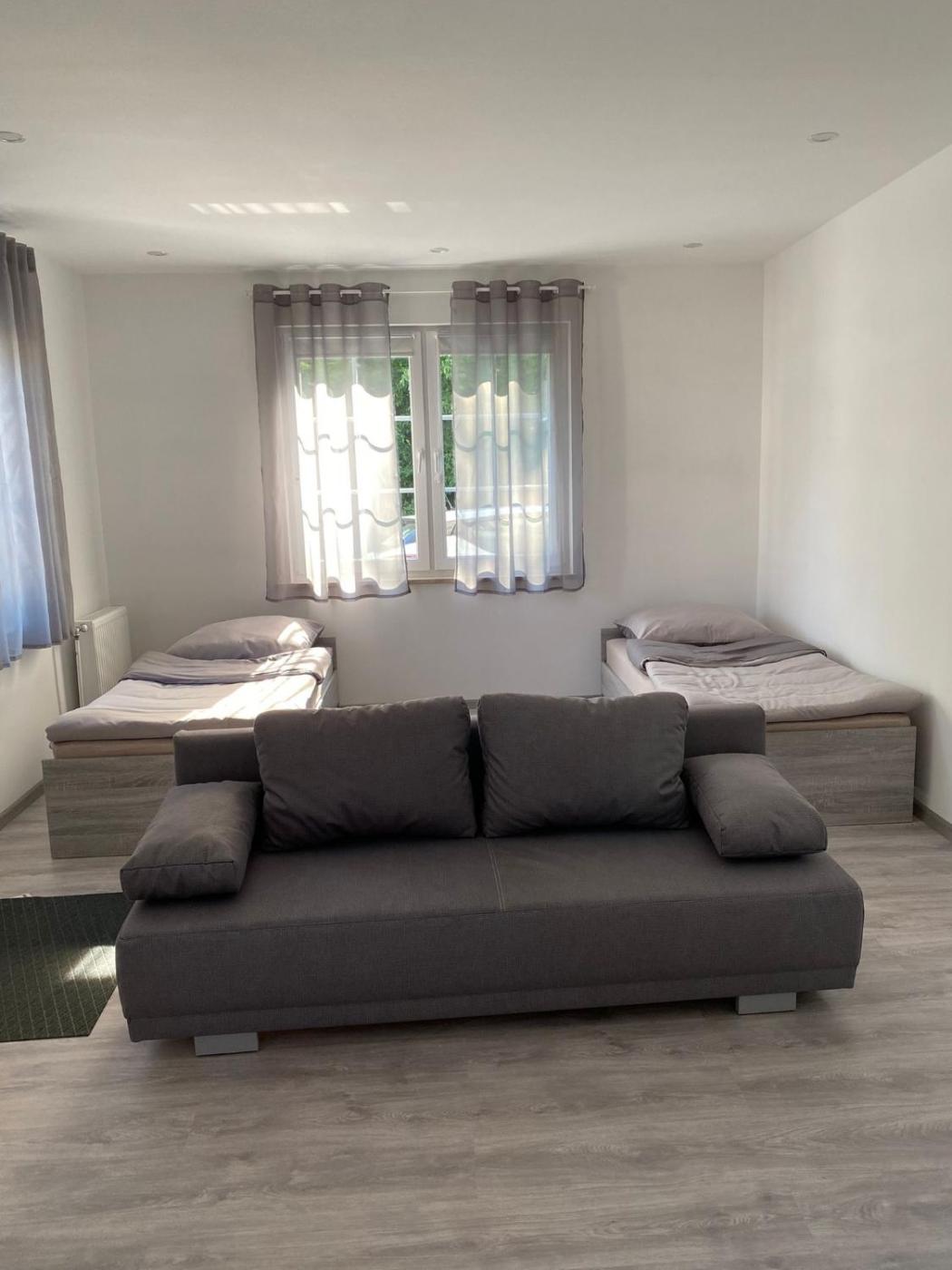 Dreibettzimmer. The triple room provides a sofa and heating, as well as a private bathroom featuring a shower. The triple rooms kitchen, which features a refrigerator and kitchenware, is available for cooking and storing food. The spacious triple room offers a private entrance, a tea and coffee maker, a seating area, a dining area, as well as a flat-screen TV with satellite channels. The unit offers 3 beds.