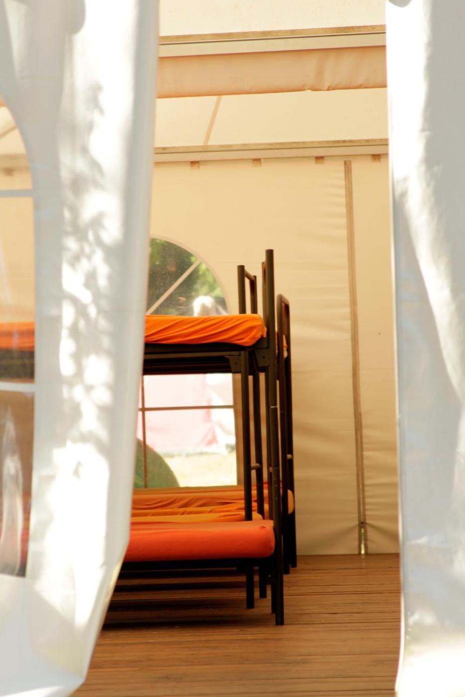 Etagenbett im gemischten SchlafsaalZelt. Dieses Bett befindet sich in einem Schlafsaal in einem großen Zelt (500 m²) mit 160 Etagenbetten. ;