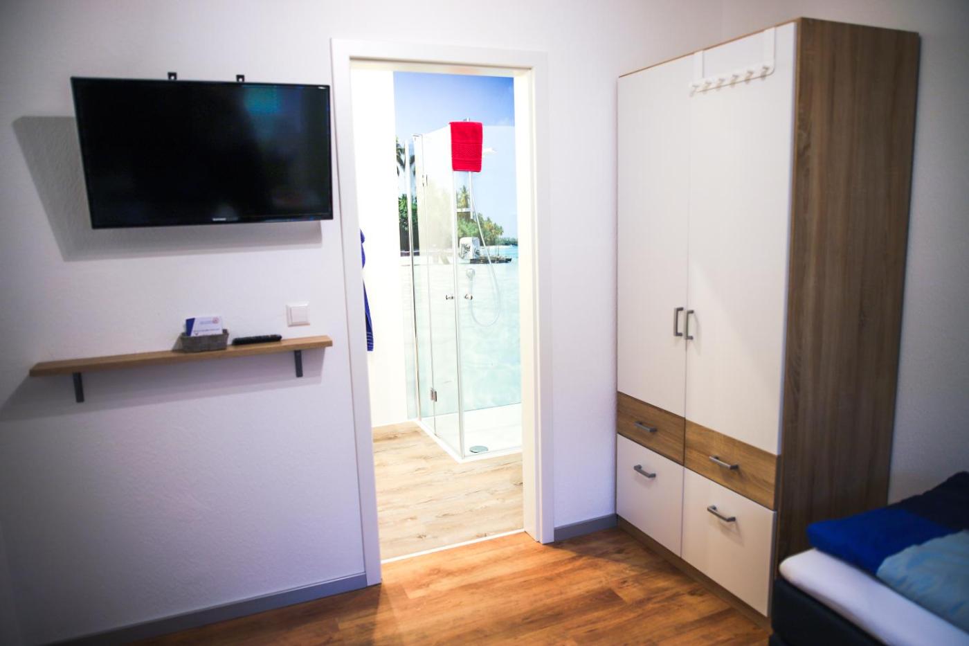 Einzelzimmer mit Dusche. The single room provides a dining area, a wardrobe, as well as a private bathroom featuring a walk-in shower. The fully equipped kitchen has a stovetop, a refrigerator, a dishwasher and kitchenware. This single room features a washing machine, a coffee machine, a flat-screen TV with satellite channels and a terrace. The unit offers 1 bed. ;