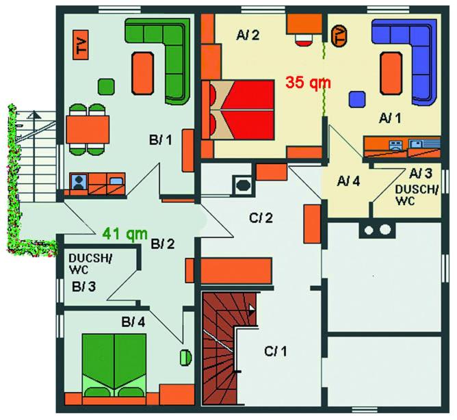 Apartment B. Featuring a private entrance, this apartment also consists of 1 bedroom, a seating area and 1 bathroom with a shower and a hairdryer. The well-equipped kitchenette features a stovetop, a refrigerator, kitchenware and a microwave. Boasting a terrace with garden views, this apartment also provides a washing machine and a flat-screen TV with satellite channels. The unit offers 3 beds. ;