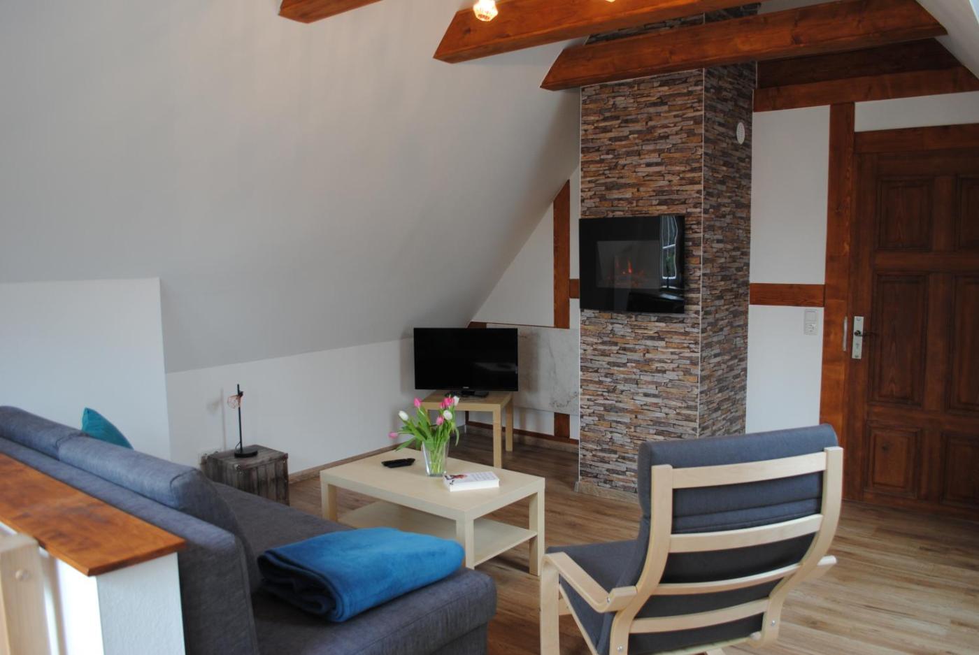 Apartment. This apartment has a spacious kitchen with dining area, a cosy livingsleeping area with electric fireplace, a separate bedroom and a sleeping camp under an attic roof. There is also a bathroom with shower and hairdryer.