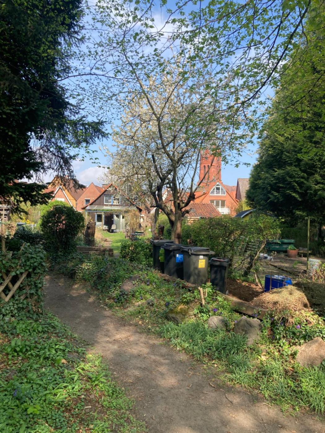 Einzelzimmer - barrierefrei. "Emergency room" in the open attic. Accessible via stairs. The room cannot be locked. Suitable for single travelers as emergency accommodation. It features a walk-in closet, a desk, and a single bed. Garden views are available. A kitchen, common room, shared bathroom, and a TV in the common room are available for use.