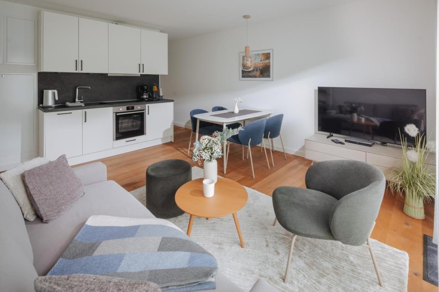 Apartment mit Balkon. This apartment comes with 1 living room, 1 separate bedroom and 1 bathroom with a shower. Guests can make meals in the kitchen that features a stovetop, a refrigerator, a dishwasher and kitchenware. Boasting a balcony, this apartment also features a coffee machine, a wardrobe and a TV. The unit has 2 beds.
