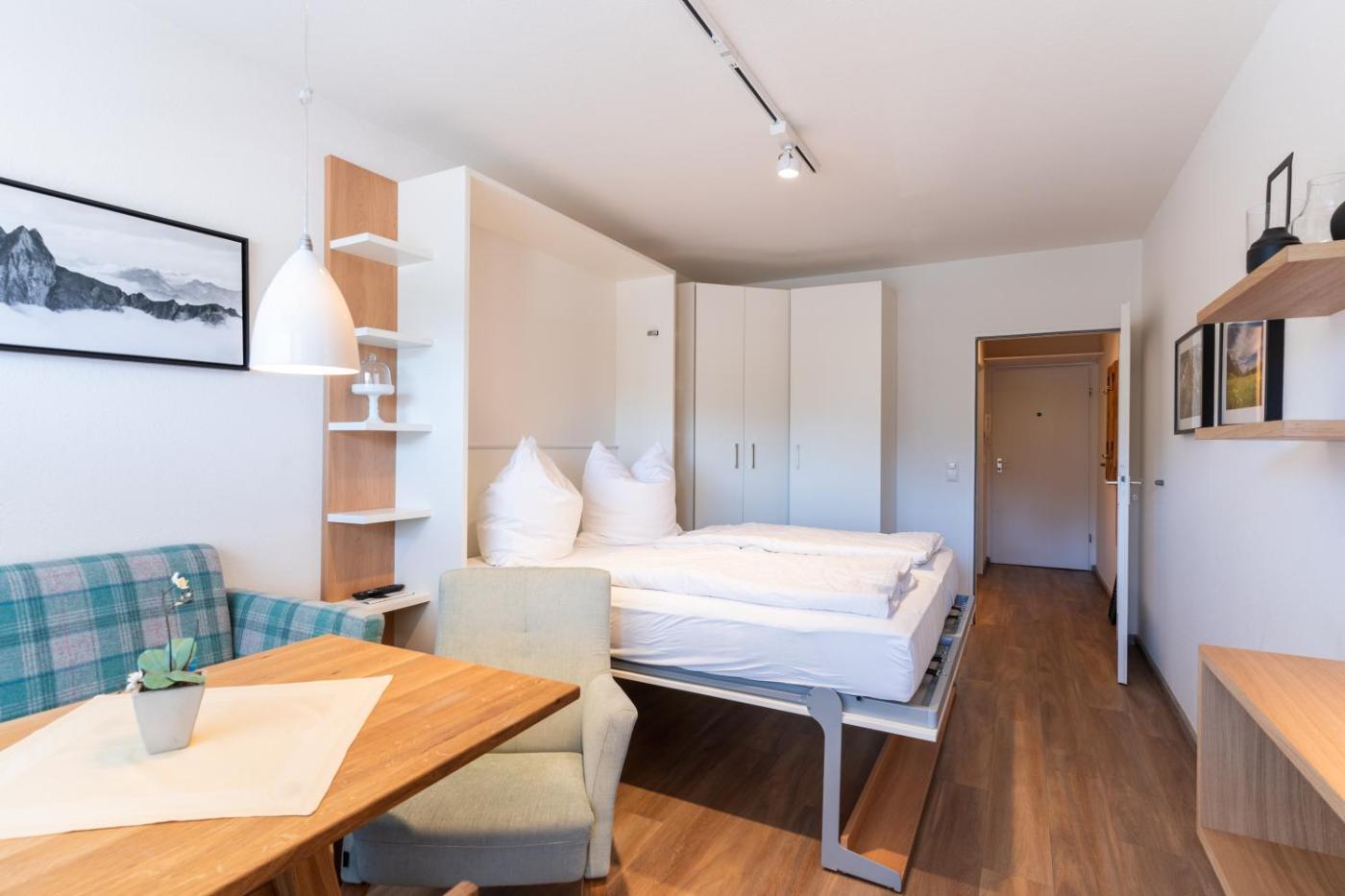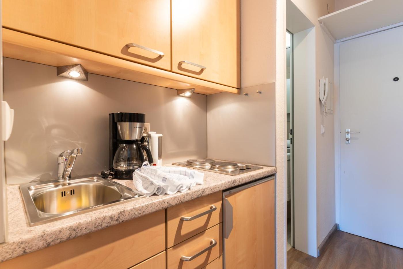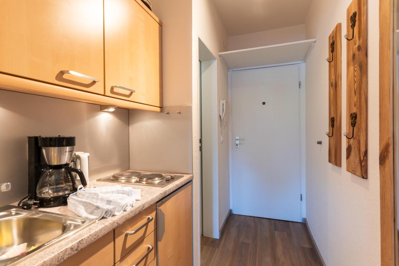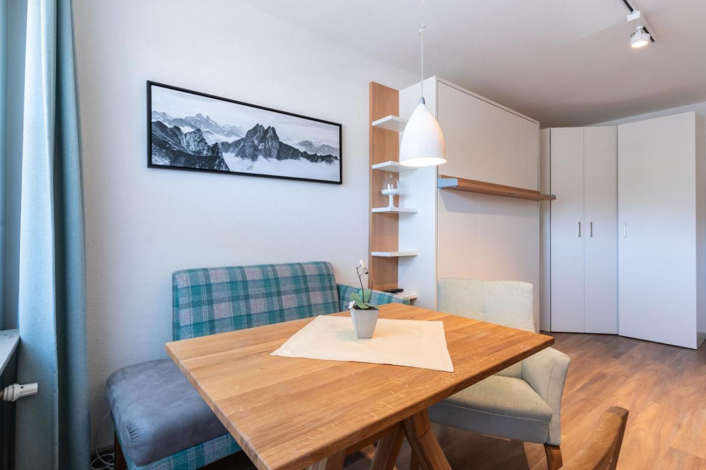 Apartment mit Balkon. Diese Kategorie verfügt über einen Südbalkon, ein Schlaf-Wohnzimmer mit einem Schrankbett, einen Essbereich, eine Küchenzeile und ein Bad mit einer Dusche und einem WC.
