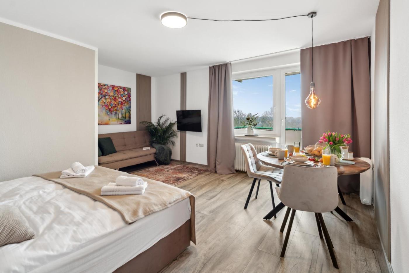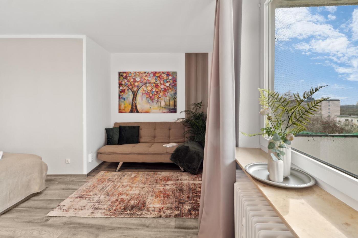Apartment mit 1 Schlafzimmer. The apartment features 1 bedroom and 1 bathroom with a shower and free toiletries. Guests can make meals in the kitchen that is equipped with a stovetop, a refrigerator, a dishwasher and kitchenware. Featuring a balcony with city views, this apartment also provides a washing machine and a flat-screen TV with cable channels. The unit offers 2 beds.