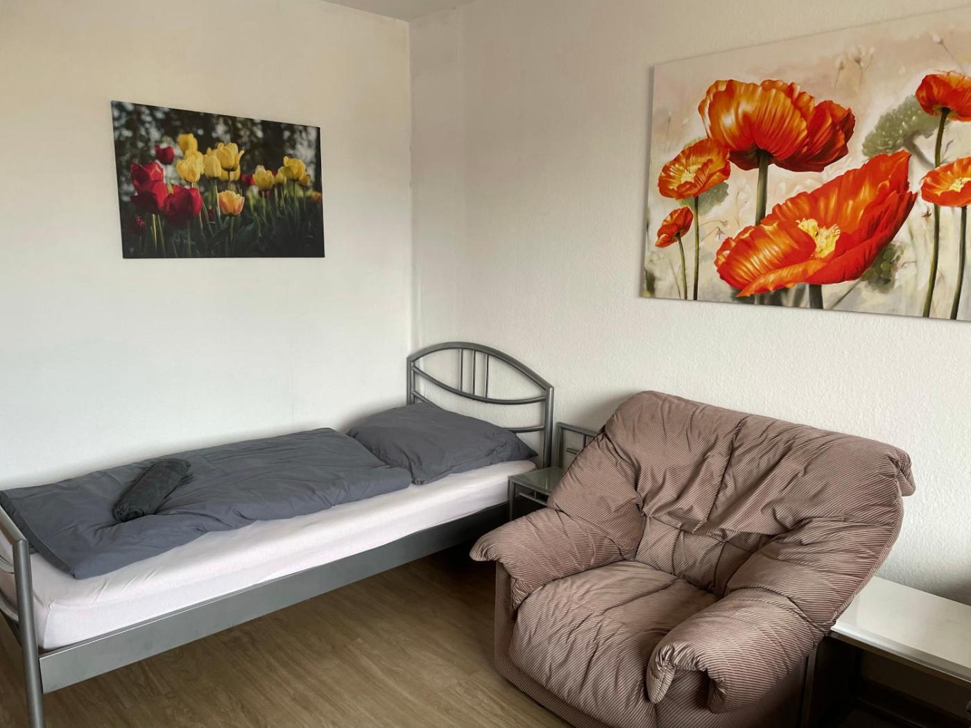 Budget Einzelzimmer. The single room features a washing machine, a tea and coffee maker, as well as a shared bathroom boasting a bath and a hairdryer. The well-equipped kitchen has a stovetop, a refrigerator, a dishwasher and kitchenware. The single room provides a flat-screen TV, a seating area, a dining area, a wardrobe as well as garden views. The unit has 1 bed. ;