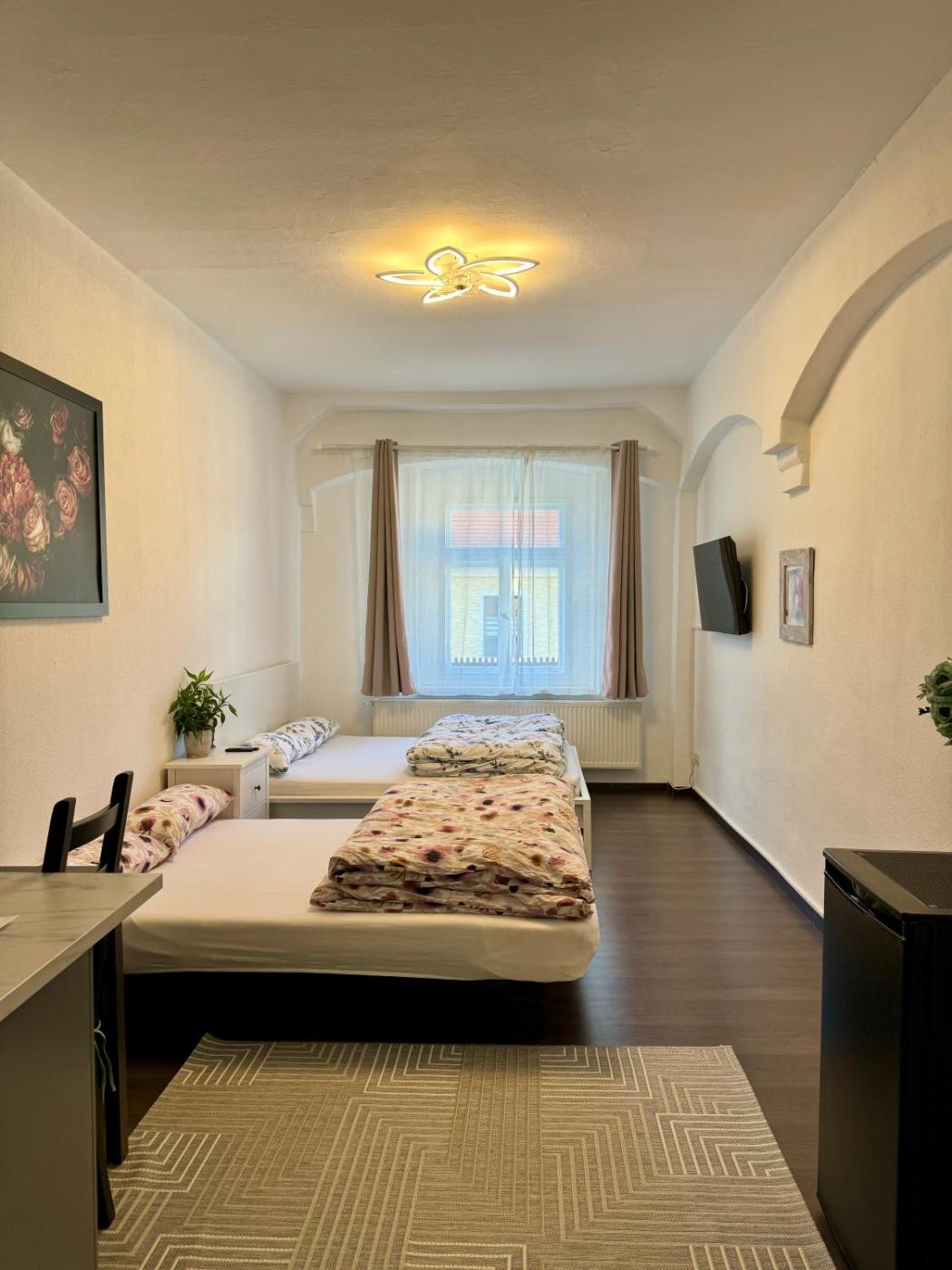 Familienzimmer mit Gemeinschaftsbad. The family room features a dining area, a wardrobe, as well as a shared bathroom boasting a hairdryer and slippers. The family room offers a flat-screen TV, a sofa, a carpeted floor, heating as well as city views. The unit has 3 beds. ;