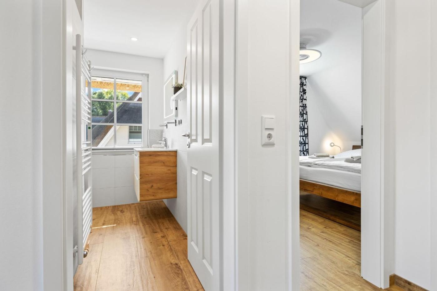 "Dünenrose" und "Tuttelduuv" unter Reet mit Kamin und Garten