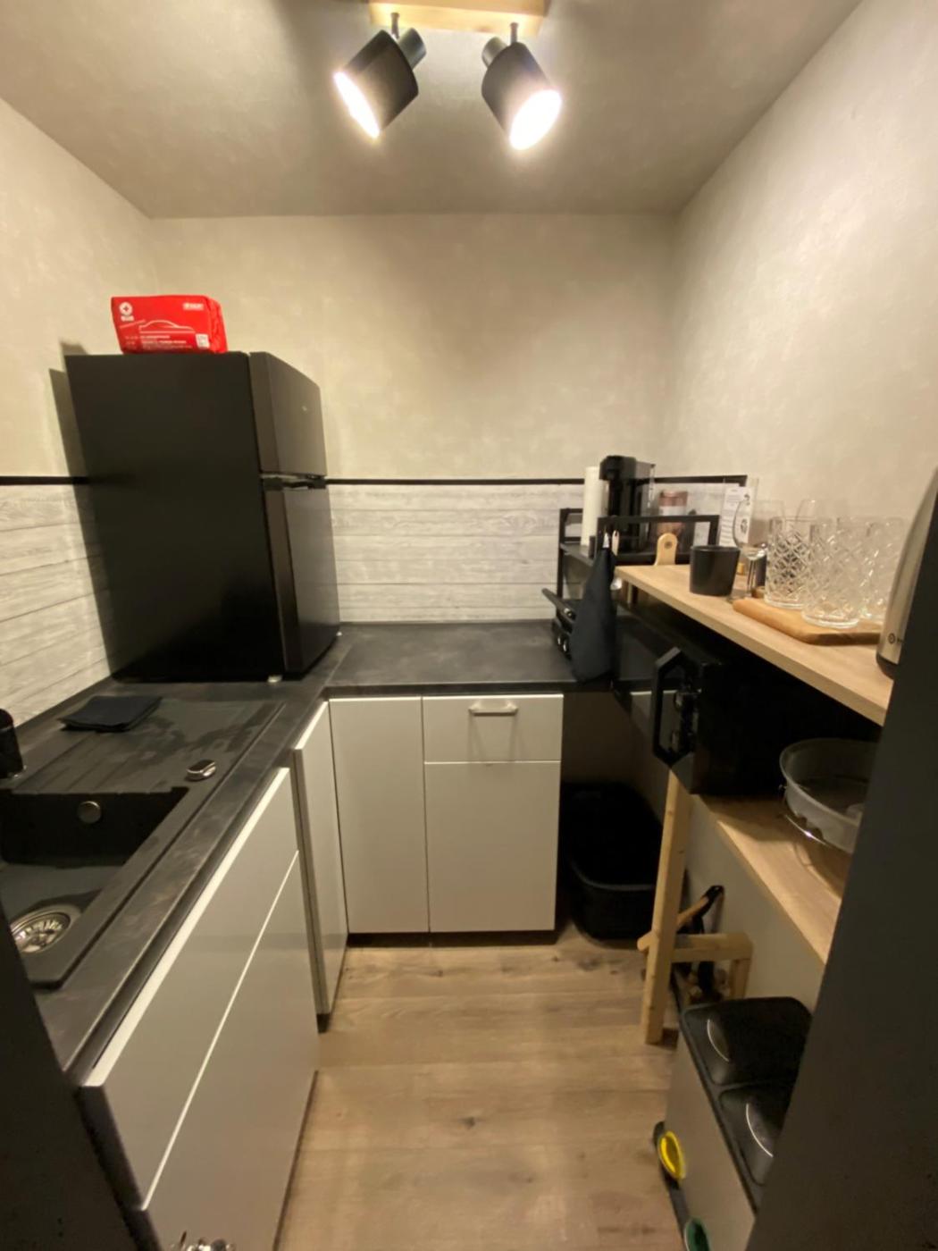 Es gibt einen Kühlschrank, eine Mikrowelle und einen Toaster sowie eine Kaffeemaschine und einen Wasserkocher.
