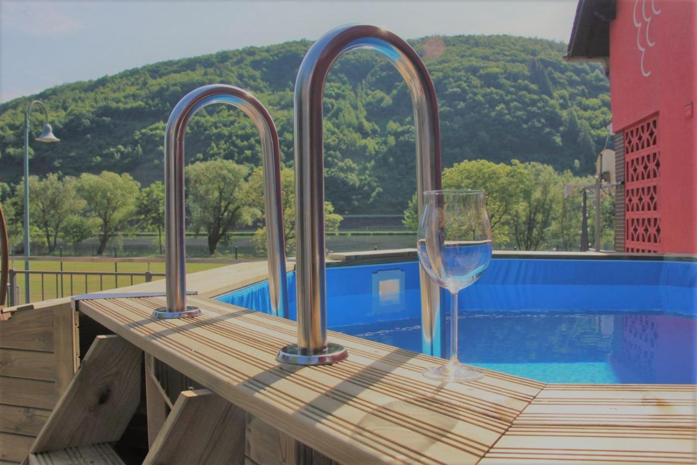 Apartment mit Balkon. The apartment features a balcony with views of the Moselle river, a kitchen in the living room, one bedroom and a bathroom with shower. It also includes a room with 2 cupboard beds with a width of 90 cm and a length of 2 metres, located next to each other. The property offers a new small sauna area with outdoor pool and adjoining wine lounge. ;