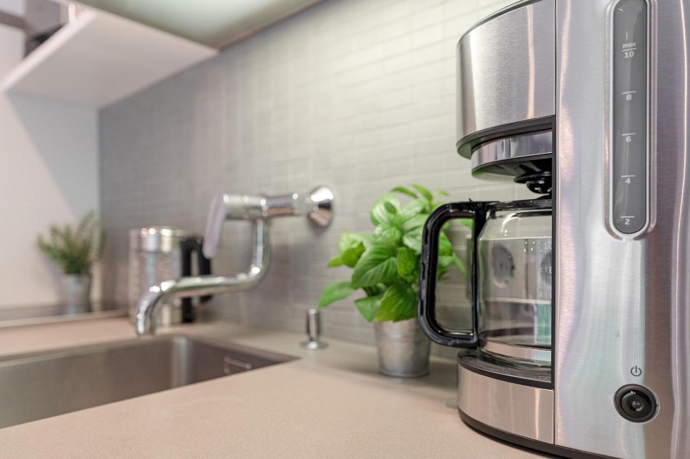 Die Küche ist eingerichtet mit einem Kühlschrank und einem Geschirrspüler, einem Ofen sowie einer Kaffeemaschine und einem Wasserkocher.