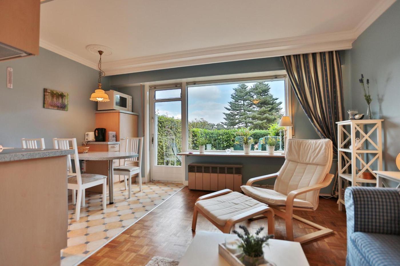Diese Ferienwohnung beinhaltet ein Wohnzimmer mit einem TV, einem Blu-ray-Player und einem DVD-Player. Die Küche ist ausgestattet mit einem Kühlschrank und einem Ofen, einer Mikrowelle sowie einer Kaffeemaschine.