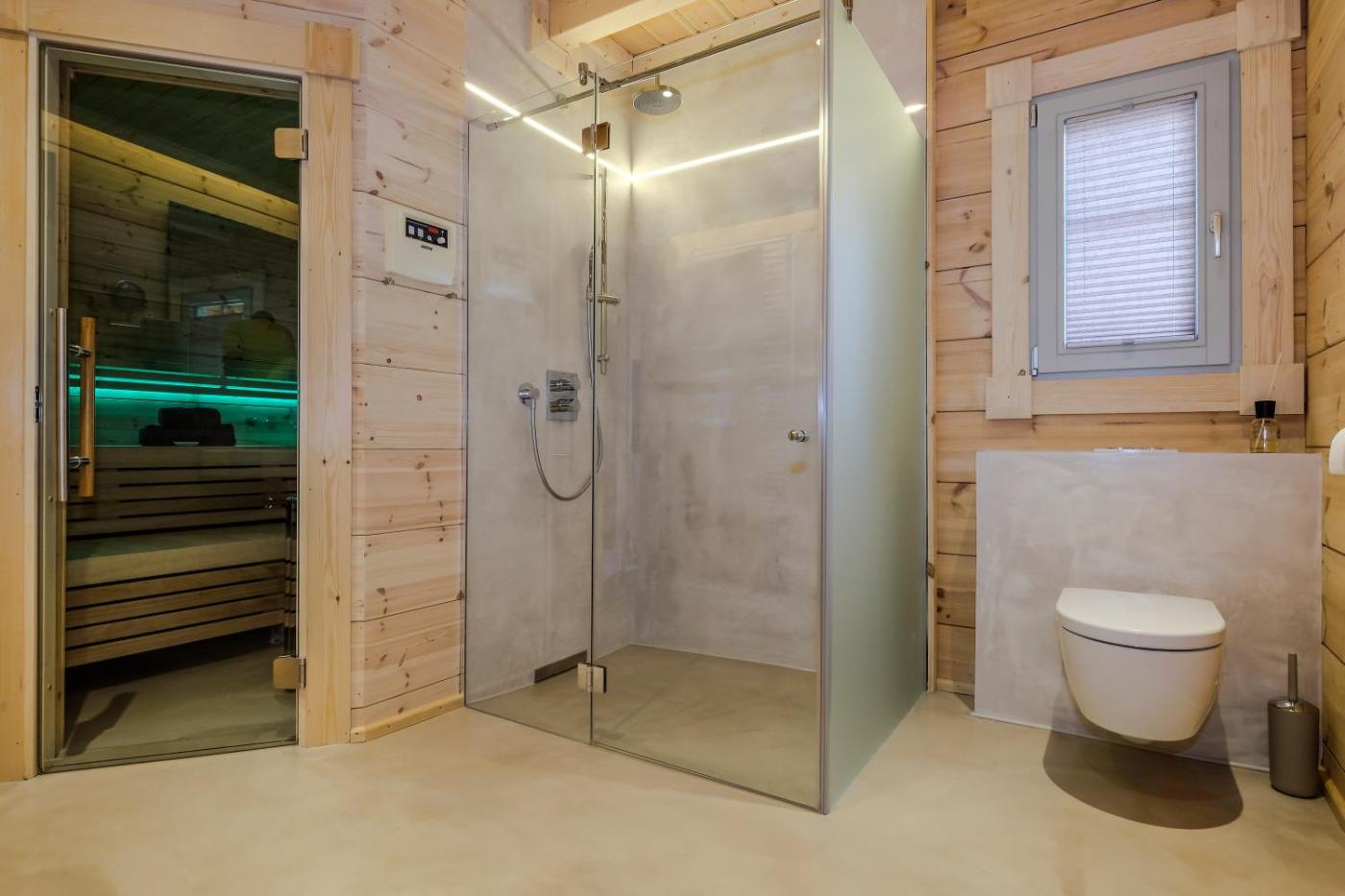 Ferienhaus. Die exklusiv eingerichtete Blockhütte bietet eine Sauna, einen Kamin, 2 Bäder und 3 Schlafzimmer.