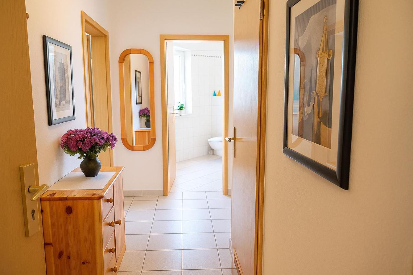Apartment mit Balkon. This apartment is comprised of a kitchen, a seating area, 1 separate bedroom and 1 bathroom with a shower and a hairdryer. In the well-equipped kitchen, guests will find a stovetop, a refrigerator, a dishwasher and kitchenware. Featuring a balcony, this apartment also offers a washing machine, a coffee machine and a TV with satellite channels. The unit offers 1 bed.