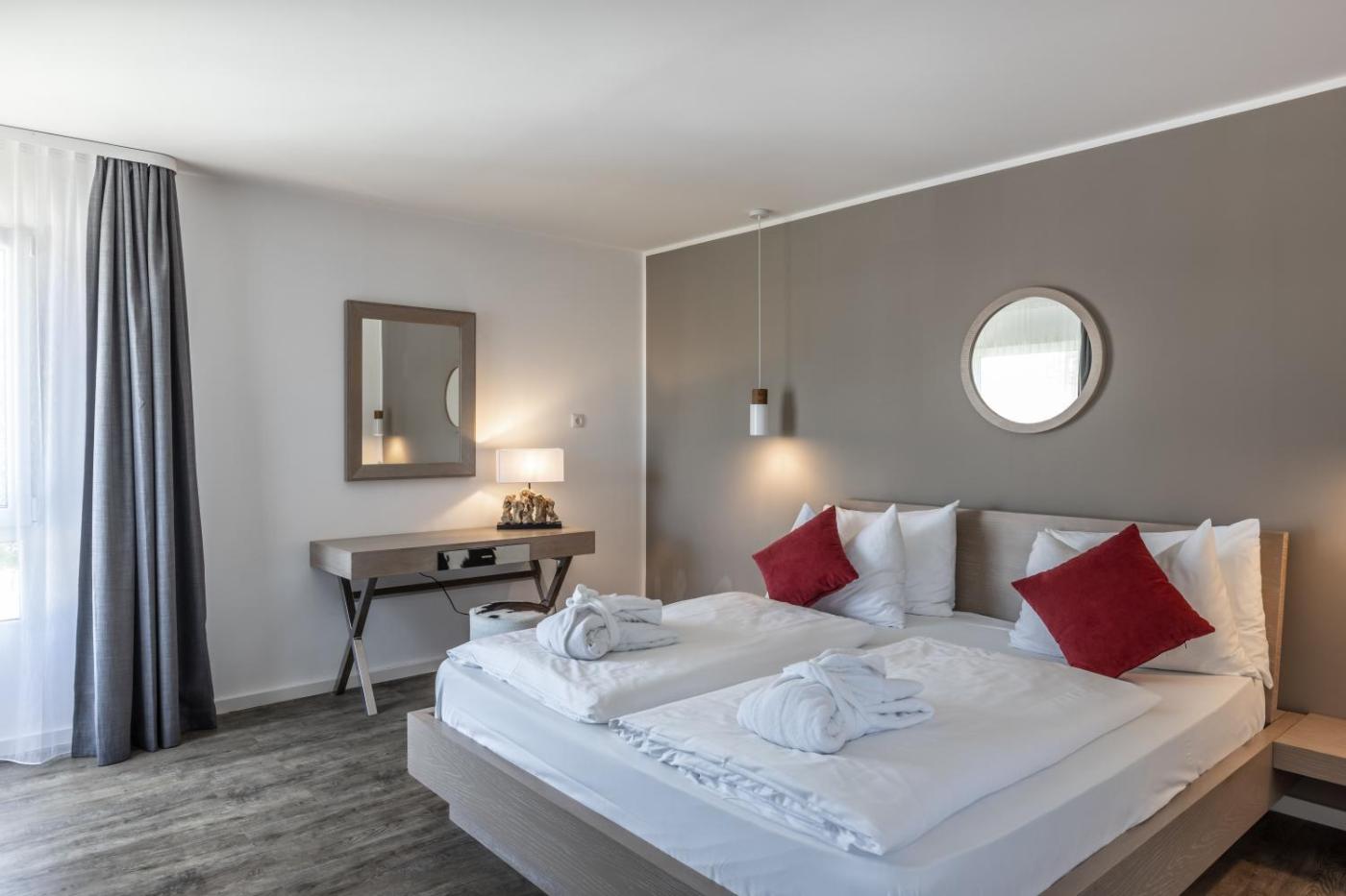 Die im Landhausstil eingerichteten Zimmer des Hotels Karma Bavaria bieten eine herrliche Aussicht auf die umliegende Landschaft.