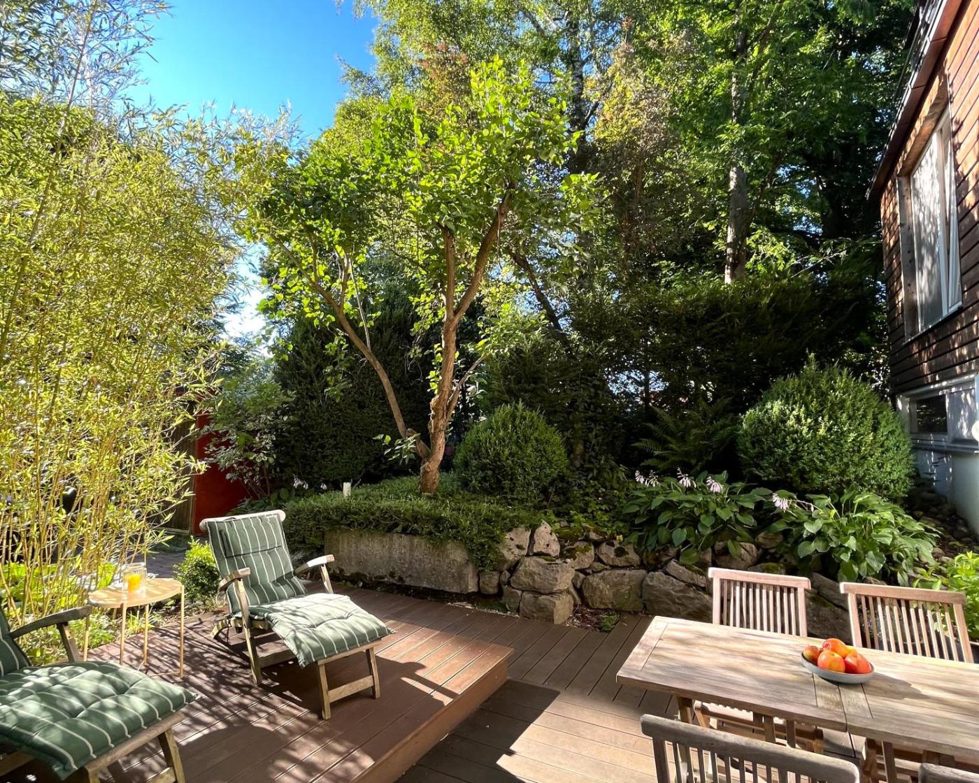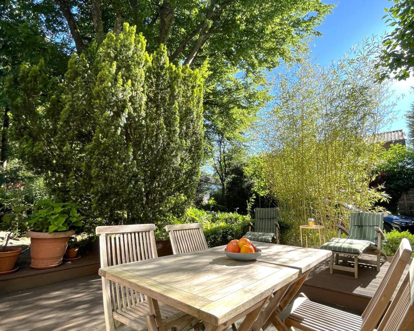 Komfortable Ausstattung: Die Apartments verfügen über eine Kitchenette, ein eigenes Badezimmer sowie eine private Terrasse mit herrlichem Blick in den Garten. Weitere Annehmlichkeiten sind ein Essbereich und ein Schlafsofa.