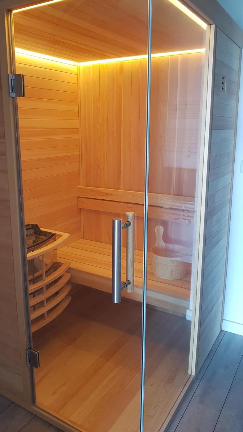 Apartment mit 1 Schlafzimmer. Zu den besonderen Vorzügen dieser Ferienwohnung gehört eine Sauna. Diese geräumige Ferienwohnung umfasst 1 Wohnzimmer, 1 separates Schlafzimmer und 1 Bad mit ebenerdiger Dusche. In der Küche mit einem Kochfeld, einem Kühlschrank, einem Geschirrspüler und Küchenutensilien können Sie eigene Mahlzeiten zubereiten. Zu den weiteren Einrichtungen dieser Ferienwohnung gehören eine Terrasse mit Meerblick, eine Kaffeemaschine sowie ein Flachbild-TV mit Streaming-Service. In der Wohneinheit befinden sich 2 Betten.