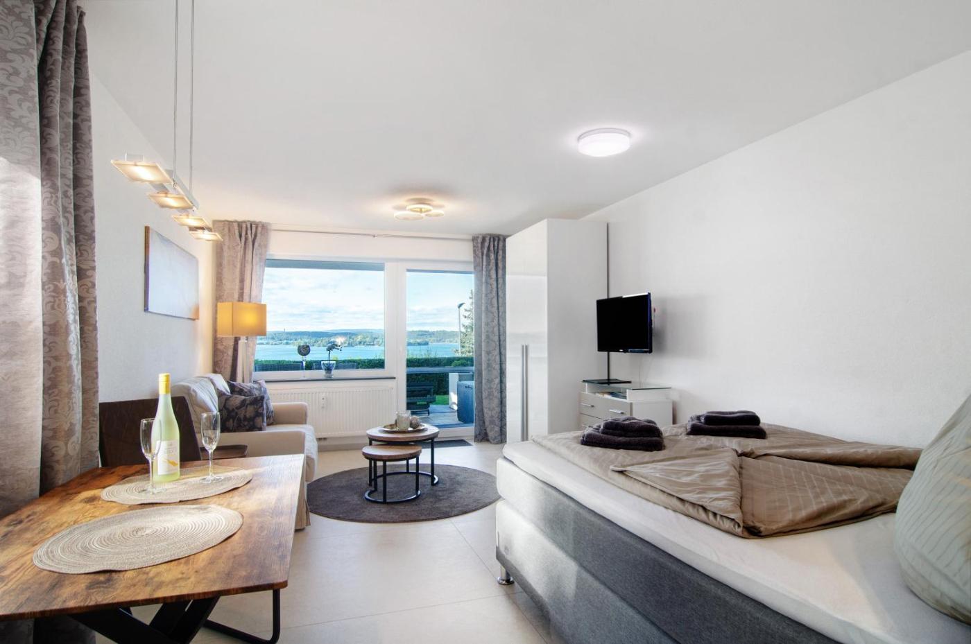 Apartment mit 1 Schlafzimmer und Seeblick. The apartment has 1 bedroom and 1 bathroom with a shower and free toiletries. In the well-equipped kitchen, guests will find a dishwasher, kitchenware, an oven and a toaster. This apartment features a coffee machine, a TV with satellite channels and lake views. The unit has 1 bed.