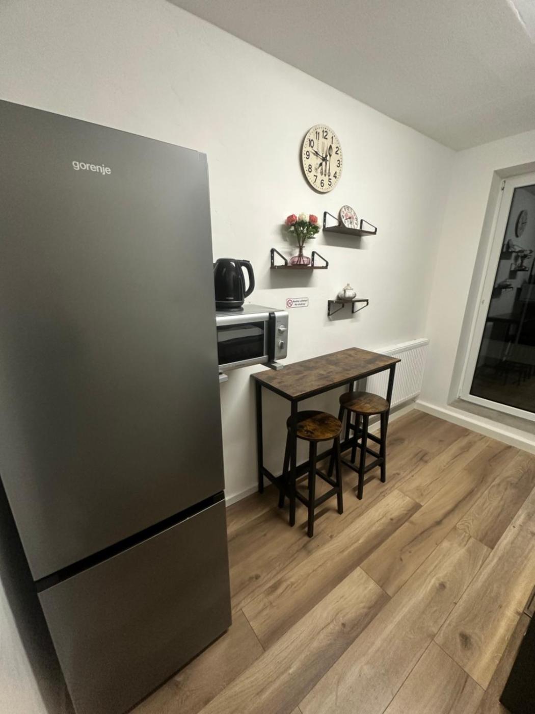 Die Küche ist versehen mit einem Kühlschrank und einer Mikrowelle sowie einer Kaffeemaschine und einem Wasserkocher.