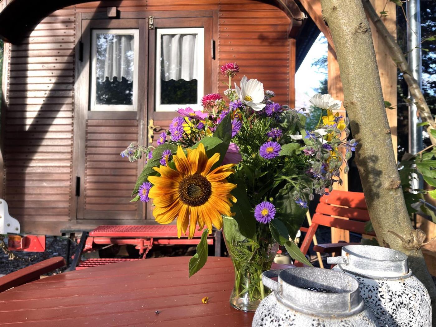 Historischer Zirkuswagen mit Terrasse und Blick ins Grüne